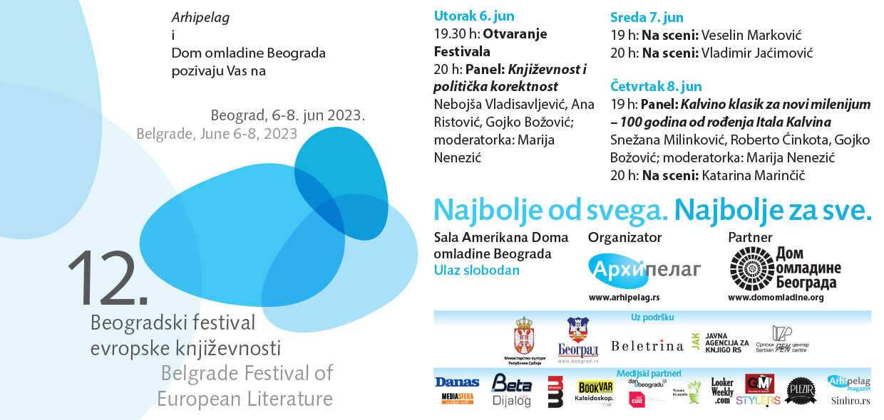 Izdavačka kuća Arhipelag, u saradnji s Domom omladine Beograda, organizuje 12. Beogradski festival evropske književnosti od 6. do 8. juna. Čitaoce očekuje uzbudljiva i sadržajna književna nedelja. Tokom tri celovečernja književna programa publika će moći da prati čitanja poznatih pisaca, ekskluzivnih gostiju Festivala, kao i dva panela o savremenoj književnosti i kulturi.