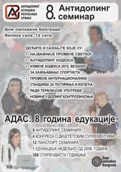Dana 22. januara 2014. u Domu omladine Beograda, Antidoping agencija Republike Srbije će organizovati VIII po redu jednodnevni seminar sa temama koje obuhvataju najnovije promene u svetskom antidoping Kodeksu, vrhovnom zakonu u borbi protiv dopinga u sportu. Cilj seminara je da se predstavnici sportskih saveza, lekari, treneri, sportisti i svi koji su uključeni u sport, upoznaju sa novousvojenim izmenjenim svetskim antidoping Kodeksom koji stupa na snagu 01.01.2015. godine.
