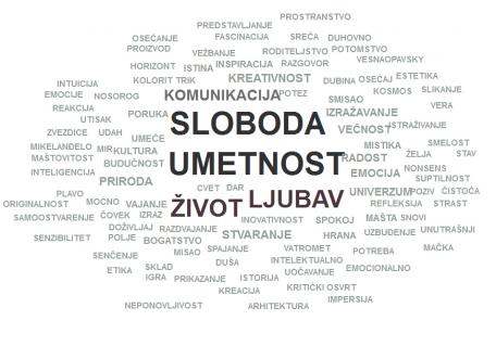 “Ljudi komuniciraju na različite načine. Zbog nedostatka vremena i koncetracije u potrošačkom društvu, opredelila sam se za sažetiji vid internet komunikacije – ključne reči. Mislim da se tako delo može lakše približiti većem broju ljudi, s obzirom da su već naviknuti na ovaj „jezik“ i umetnost ne bi trebalo, na dalje, da predstavlja samo sadržaj za maštovite, nadarene i posebne. Cilj izložbe je upravo taj da se publika oseti kao deo kreativnog, umetničkog procesa – učestvujući u kreiranju sadržaja za umetničko delo, koje je u fazi nastajanja na ovoj izložbi. Na taj način, umetnost se približava publici i pulika umetnosti”, ističe autorka.