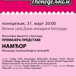U okviru „Pozorišta ponedeljkom“, 31. marta od 20 časova u Velikoj sali Doma omladine premijerno će biti izvedena predstava „Namćor“, koju su po Menandrovoj realizovali studenti Filološkog fakulteta.