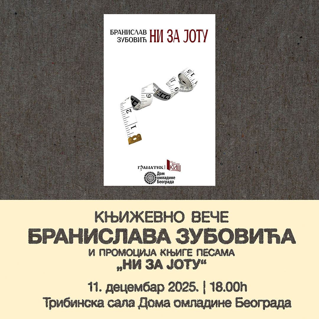 Dom omladine Beograda, Javna biblioteka „Danilo Kiš“ Vrbas i Gramatik Beograd pozivaju vas na književno veče Branislava Zubovića i promociju nove knjige pesama „Ni za jotu” (Javna biblioteka „Danilo Kiš“ Vrbas; Gramatik, Beograd, 2025).