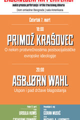 Primož Krašovec: “O nekim protivurečnostima postsocijalističke europske ideologije” (18h) // Asbjørn Wahl: “Uspon i pad države blagostanja” (20h).