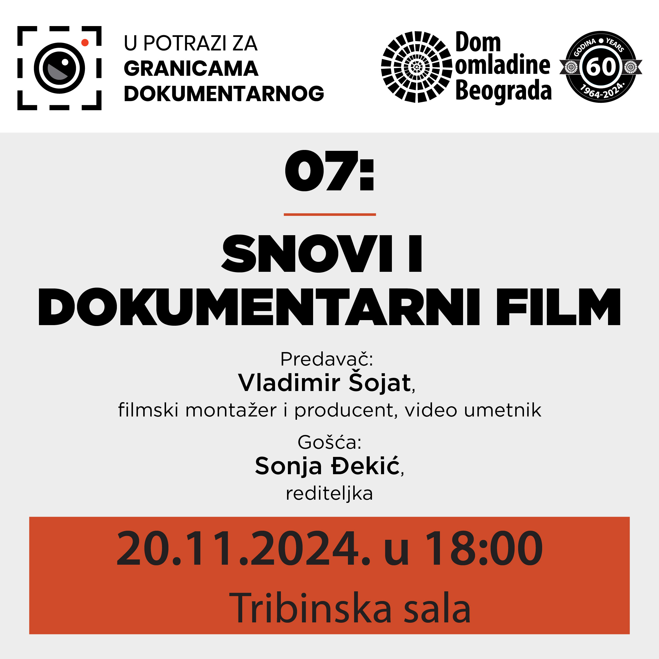 Dom omladine Beograda je u februaru 2024 pokrenuo seriju predavanja o temama vezanim za aktuelnu svetsku produkciju dokumentarnih filmova. Predavanja su fokusirana na fenomene i najnovije tendencije u okviru ove filmske vrste koja je doživela veliku afirmaciju tokom poslednjih 15 godina, a sada doživljava unutrašnju transformaciju, kroz aktivnosti autora koji istražuju granice dokumentarnog izraza: medijske, tehnološke, moralne, žanrovske, ali i granice između fikcije i stvarnosti, objekta i subjekta. Problematika društva spektakla (Society of Spectacle) koju tako tačno poentira 1967. francuski filozof i filmski autor Gi Debor, i danas je aktuelna, možda i više nego što je to bio slučaj pre 50 godina. Prateći ove tendencije pokušavamo da motivišemo mlade sadašnje i buduće aktere digitalnog sveta slika da sa radoznalošću gledaju i istražuju svet oko sebe, a možda i da pokušaju da ga promene.