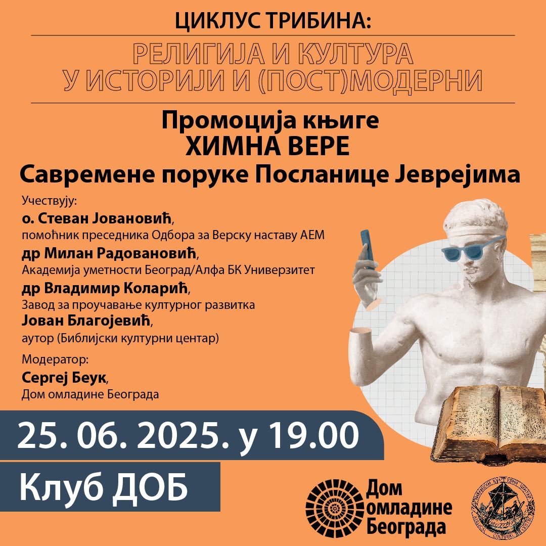 Nakon nekoliko uspešnih ciklusa tribina koje je Dom omladine Beograda realizovao u saradnji sa Biblijskim kulturnim centrom, a u okviru kojih smo se iz različitih uglova i vidovima međusobnog prožimanja, bavili temamama religije, civilizacije, kulture i istorij, tokom 2025. godine nastavljamo sa razmatranjem ovih oblasti. Kroz ciklus tribima “Religija i kultura u istoriji i (post)moderni” postavljamo šira pitanja: šta znači živeti u vremenu kada se kultura i religija dovode u pitanje, kada se tradicionalne vrednosti preispituju, a novi izazovi zahtevaju sveže odgovore? Možemo li iz iskustava prošlosti izvlačiti smernice za budućnost, i na koji način istorijske ideje mogu da inspirišu rešenja za savremene dileme? Savremeni svet karakteriše prefiks post-, tako da živimo u post-hrišćanskom svetu, post-(post) modernom dobu, a možda i post-kulturnom. I kultura i religija se suočavaju sa brojnim, često i zajedničkim izazovima sveta u kojem su se dugo podrazumevale, ali koji ih sve više doživljava kao suvišne ili čak strane faktore. Da li istorijsko iskustvo može da nam pomogne da u postmodernom svetu nađemo obrazac koji će religiji i kulturi obezbediti mesto i mogući uticaj?
