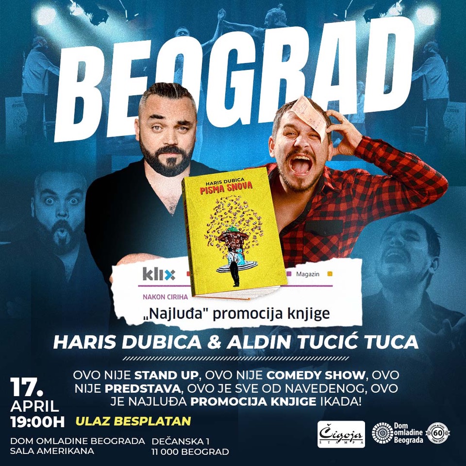 Ovo nije predstava, ovo nije stand up, a nije ni comedy show, ovo je zapravo SVE od navedenog, kako sam autor Pisma snova kaže: „ovo je najluđa promocija knjige ikada”!