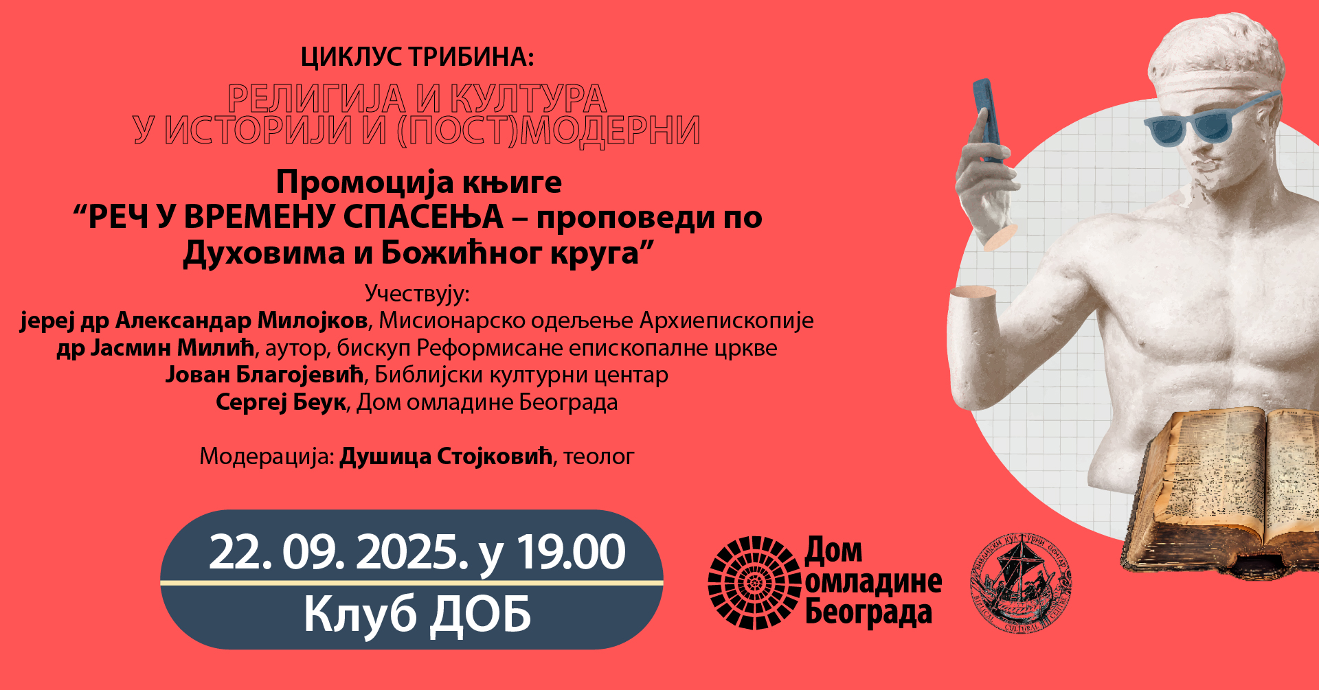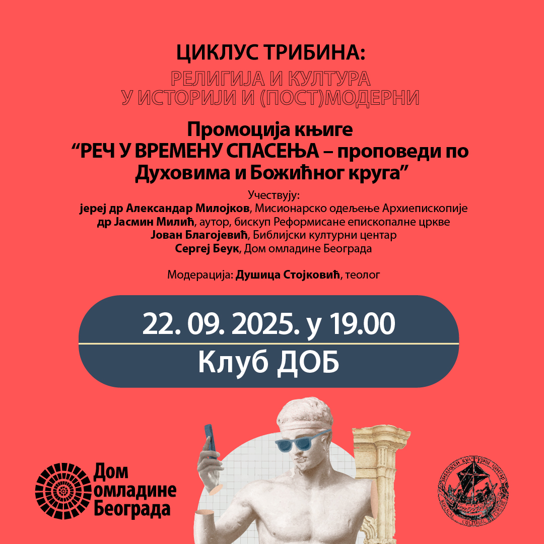 Nakon nekoliko uspešnih ciklusa tribina koje je Dom omladine Beograda realizovao u saradnji sa Biblijskim kulturnim centrom, a u okviru kojih smo se iz različitih uglova i vidovima međusobnog prožimanja, bavili temamama religije, civilizacije, kulture i istorij, tokom 2025. godine nastavljamo sa razmatranjem ovih oblasti. Kroz ciklus tribima “Religija i kultura u istoriji i (post)moderni” postavljamo šira pitanja: šta znači živeti u vremenu kada se kultura i religija dovode u pitanje, kada se tradicionalne vrednosti preispituju, a novi izazovi zahtevaju sveže odgovore? Možemo li iz iskustava prošlosti izvlačiti smernice za budućnost, i na koji način istorijske ideje mogu da inspirišu rešenja za savremene dileme? Savremeni svet karakteriše prefiks post-, tako da živimo u post-hrišćanskom svetu, post-(post) modernom dobu, a možda i post-kulturnom. I kultura i religija se suočavaju sa brojnim, često i zajedničkim izazovima sveta u kojem su se dugo podrazumevale, ali koji ih sve više doživljava kao suvišne ili čak strane faktore. Da li istorijsko iskustvo može da nam pomogne da u postmodernom svetu nađemo obrazac koji će religiji i kulturi obezbediti mesto i mogući uticaj?