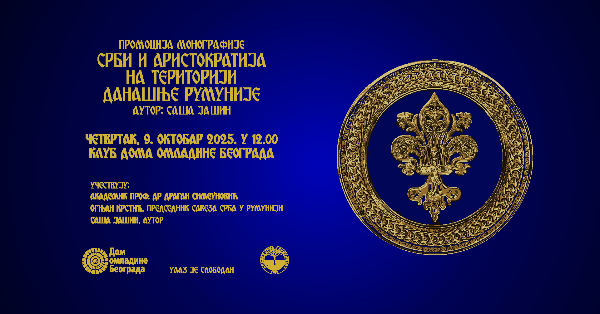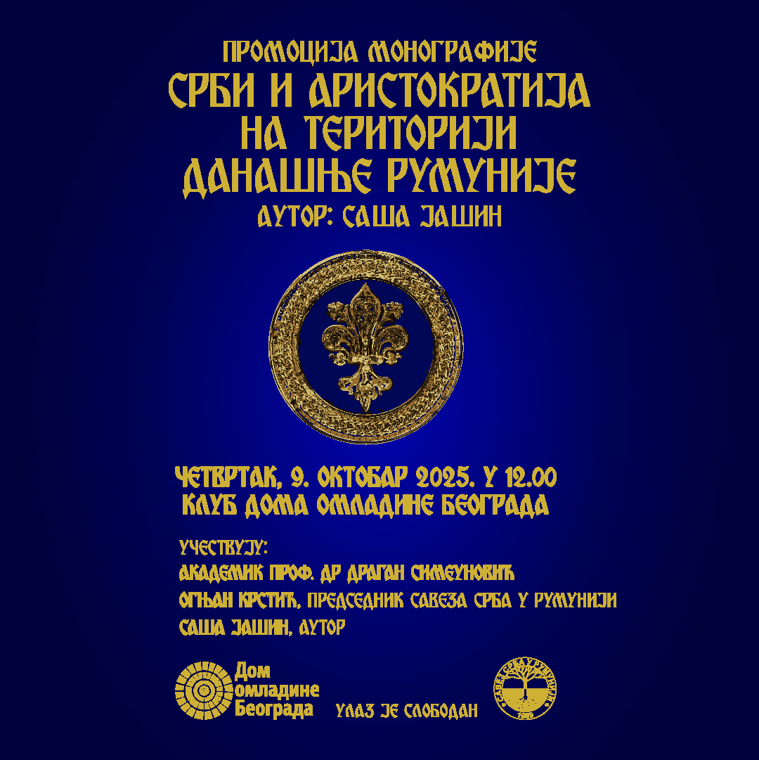 U organizaciji Doma omladine Beograda i Saveza Srba u Rumuniji, biće predstavljena monografija autora Saše Jašina „Srbi i aristokratija na teritoriji današnje Rumunije“. Ova značajna knjiga, za temu ima nastanak i evoluciju srpske plemićke elite, od srednjeg veka do početka 20. veka, na teritoriji današne Rumunije, a obuhvaćeni su podaci koji se odnose na 200 srpskih porodica. Učestvuju: akademik prof. dr Dragan Simeunović; predsednik Saveza Srba u Rumuniji i poslanik Ognjan Krstić; autor, Saša Jašin. Ulaz je slobodan.