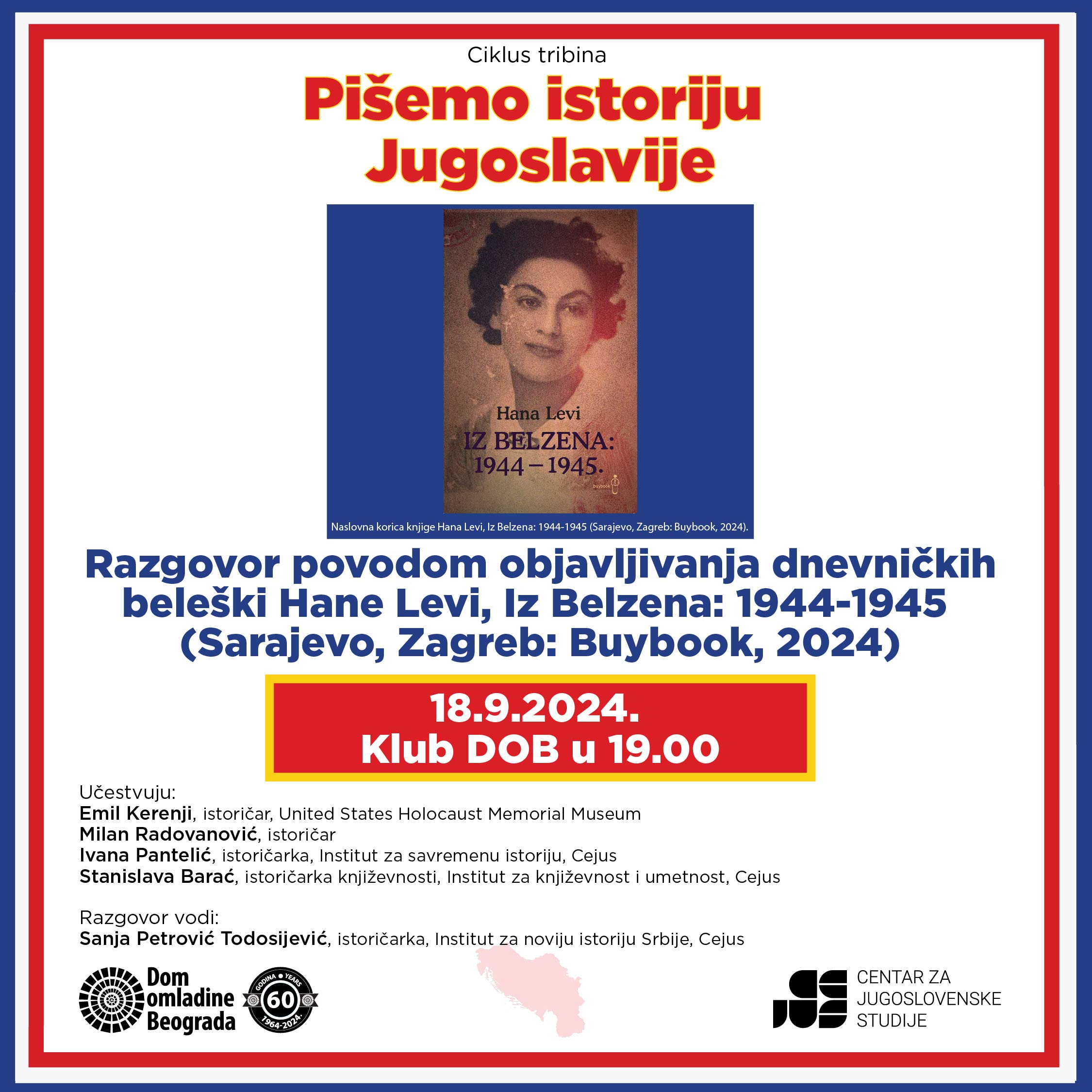 Centar za jugoslovenske studije i Dom omladine Beograda imaju zadovoljstvo da u okviru tribinskog programa „Pišemo istoriju Jugoslavije“ pokrenu razgovor povodom objavljivanja dnevničkih beleški Hane Levi (1913, Sarajevo – 2001, Jerusalim) Iz Belzena: 1944-1945. (Sarajevo, Zagreb: Buybook, 2024), nastalih u Koncentracionom logoru Bergen Belzen tokom 1944. i 1945. godine. Uz izuzetan predgovor, Hanine ćerke i novinarke Amire Hass, kao i pogovor Emila Kerenjija, istoričara Nacionalnog Muzeja Holokausta u Vašingtonu, Hanine beleške pružaju uvid, ne samo u različite apekte Holokausta, već pokreću mnoštvo pitanja koja duboko zadiru u istoriju „obe“ jugoslovenske države. Kao pardigmatična, ali u isto vreme i retka predstavnica svoje generacije, Hana Levi je kroz „zapis“ iz Logora ponudila nesvakidašnji istorijski izvor koji otvara mnoga „sklonjena“ pitanja istorije Holokausta i položaja jevrejske zajednice kao i levo orijentisanih pripadnika jugoslovenske jevrejske zajednice unutar socijalističke Jugoslavije, ali i Evrope i sveta koji su se definisali u senci „totalnog“ rata. Hanino svedočanstvo o zločinu koji je tokom Drugog svetskog rata počinjen nad pripadnicima jevrejskog naroda, pokazuje do koje mere je nemoguće odvojiti „sećanje na zločin“ od brojnih drugih identitetskih pitanja koja zadiru u privatno, ali i javno (političko). Kao „sasvim običan“ ali izuzetno dinamičan učesnik istorijskog procesa, Hana „ide dalje“ tako što „ide za sobom“ napuštajući Jugoslaviju i odlazeći u Izrael, da bi se kao oštar kritičar političkog establišmenta zemlje koju je smatrala svojom, uvek iznova vraćala u onu koja ju je definisala kao Jugoslovenku i levičarku.