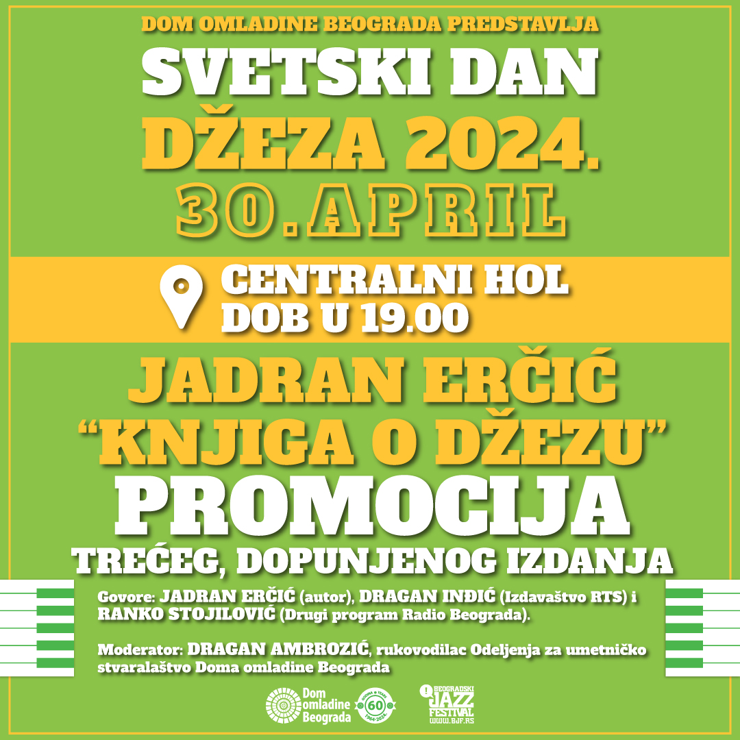 U sklopu obeležavanja Svetskog dana džeza, promovišemo treće dopunjeno i prošireno izdanje “Knjige o džezu” Jadrana Erčića, dugogodišnjeg autora i voditelja emisije “Džez panorama” na programu Stereorame Radio Beograda, koju je objavilo Izdavaštvo RTS u saradnji sa Knjigom komerc. Govore: Jadran Erčić (autor), Dragan Inđić (Izdavaštvo RTS) i Ranko Stojilović (Drugi program Radio Beograda). Moderator: Dragan Ambrozić, rukovodilac Odeljenja za umetničko stvaralaštvo Doma omladine Beograda.