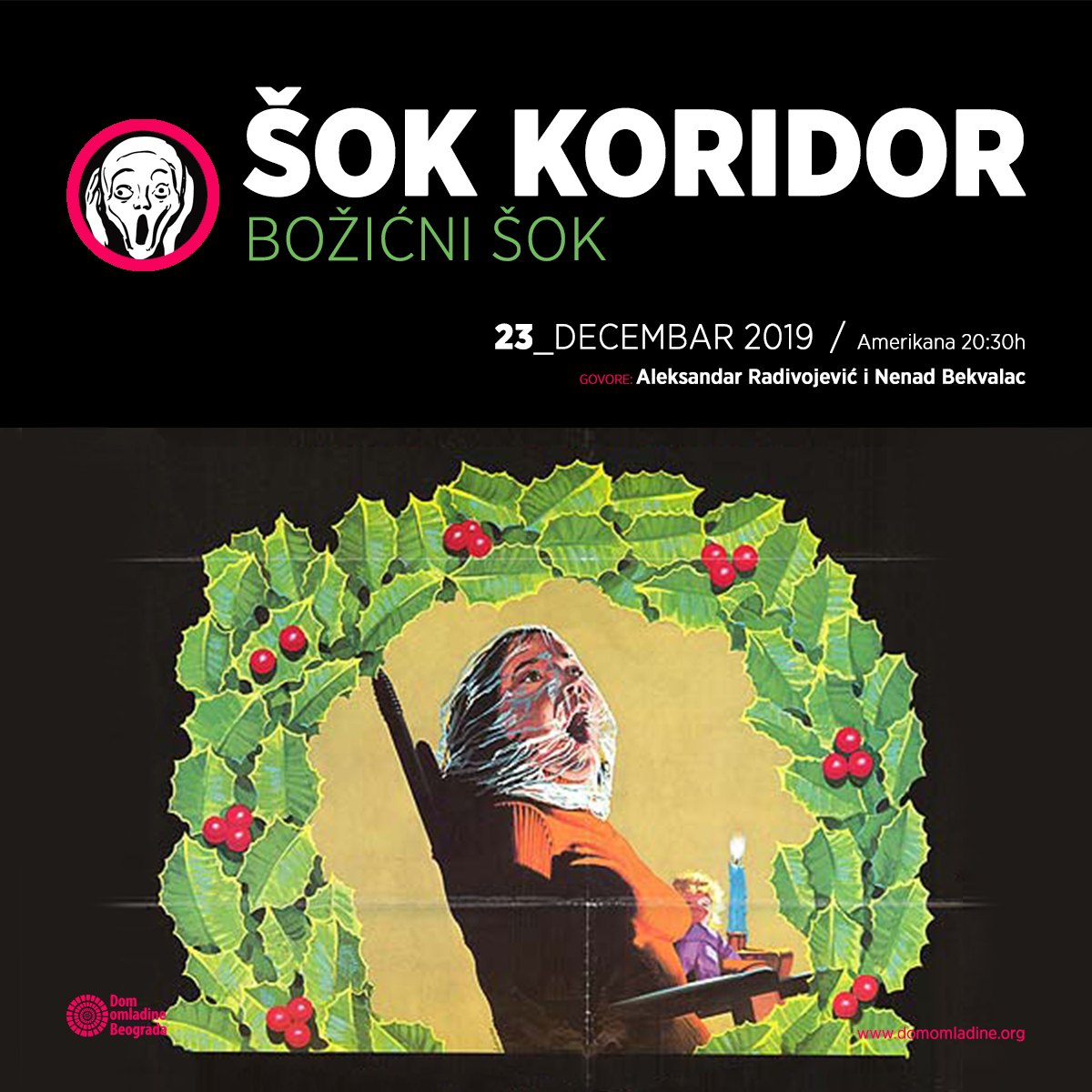 Možda ona nekome i nije tako mračna. Prošetaćemo se kroz svetsku kinematografiju i pronaći za vas inserte iz filmova čiji su autori prazničnu atmosferu obojili uglavnom u krvavo crveno. Pridružite nam se u istraživanju BOŽIĆNOG ŠOKA 23.12. u 20:30 u DOMU OMLADINE BEOGRADA