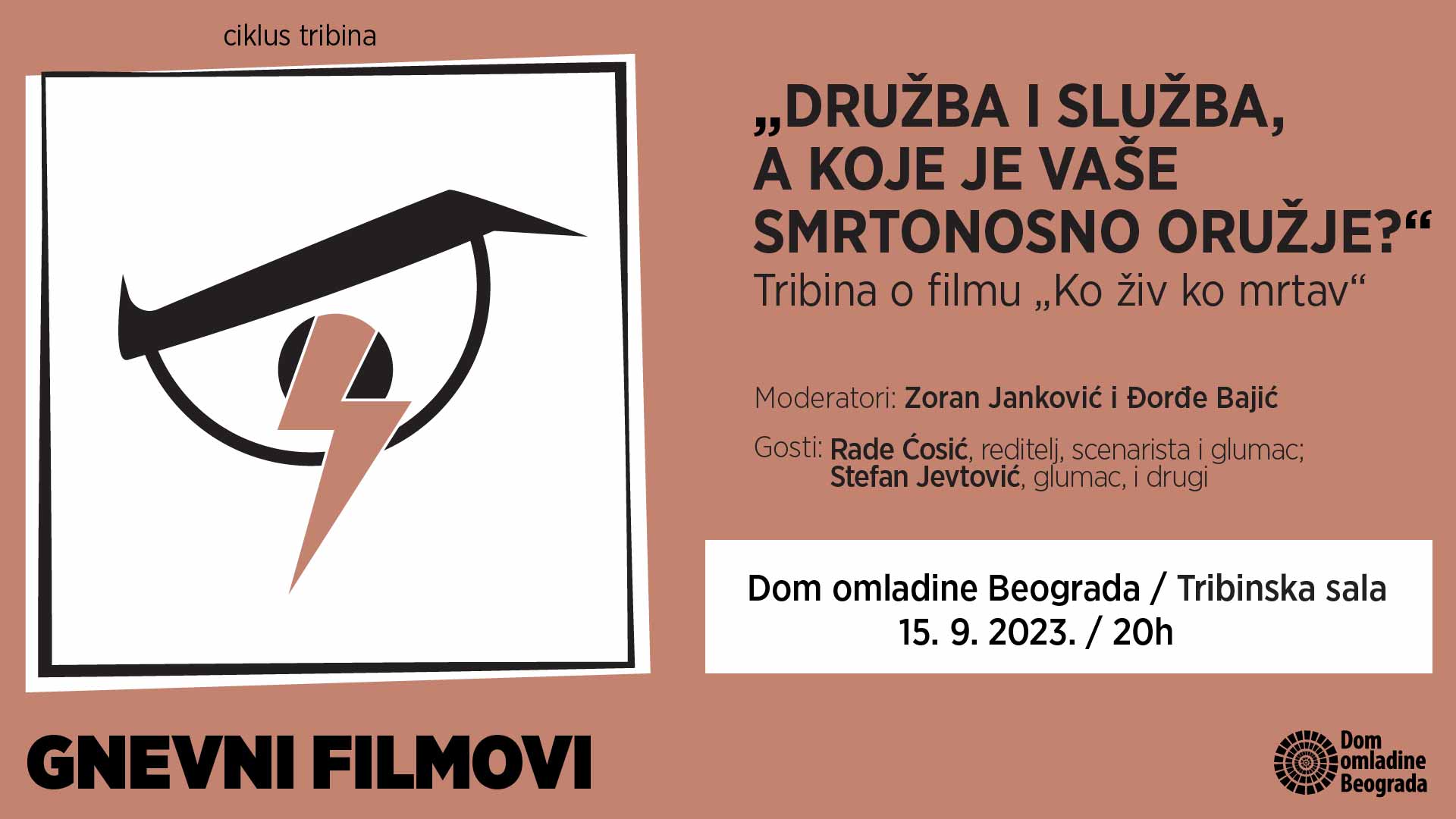 Nakon uobičajenog letnjeg predaha, ciklus „Gnevni filmovi“ u Domu omladine Beograde (DOB) nastaviće se u petak, 15. septembra,  tribinom nazvanom  „Družba i služba – a koje je vaše smrtonosno oružje?“. Tom prilikom u žiži će se naći rediteljski prvenac glumca Radeta Ćosića, dugometražni igrani film „Ko živ ko mrtav“, nedavno ovenčan Nagradom publike na Festivalu filmskog scenarija u Vrnjačkoj Banji. Na 58. Filmskim susretima u Nišu mladi glumac Stefan Jevtović osvojio je titulu Glumca prve festivalske večeri, kao i specijalno priznanje festivalskog žirija. To su bila prva javna prikazivanja pomenutog filma.