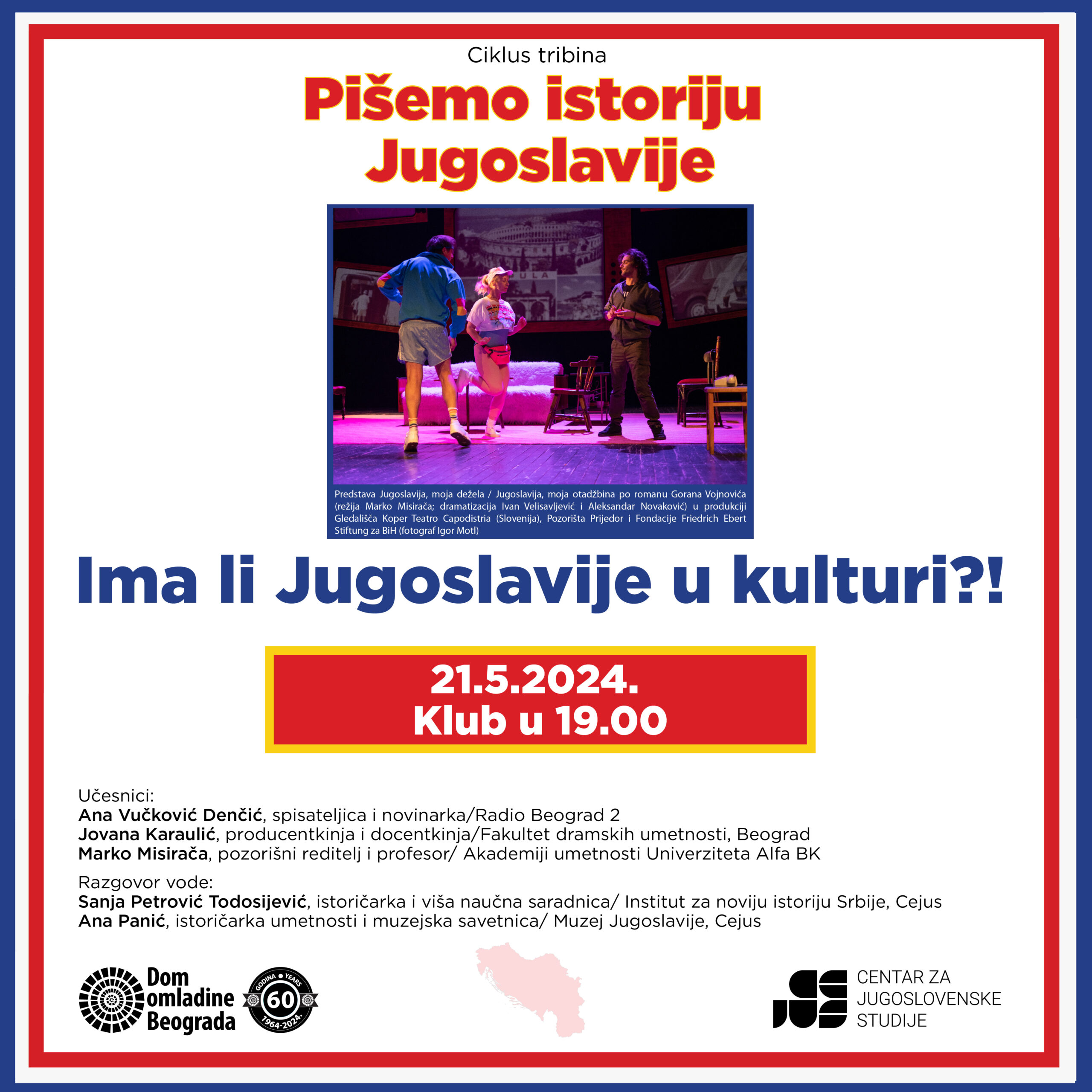 Ima li Jugoslavije u kulturi?! je pitanje koje postavljamo gostima naše majske tribine: Ani Vučković Denčić, Jovani Karaulić i Marku Misirači čije je stvaralaštvo „opredeljeno“ i ka interpretaciji Jugoslavije bilo da se ona razume kao okvir za sećanje na detinstvo i one kojih više nema, kao dokumentarno pamćenje ili kao mehanizam za razumevanje vremena u kome živimo.