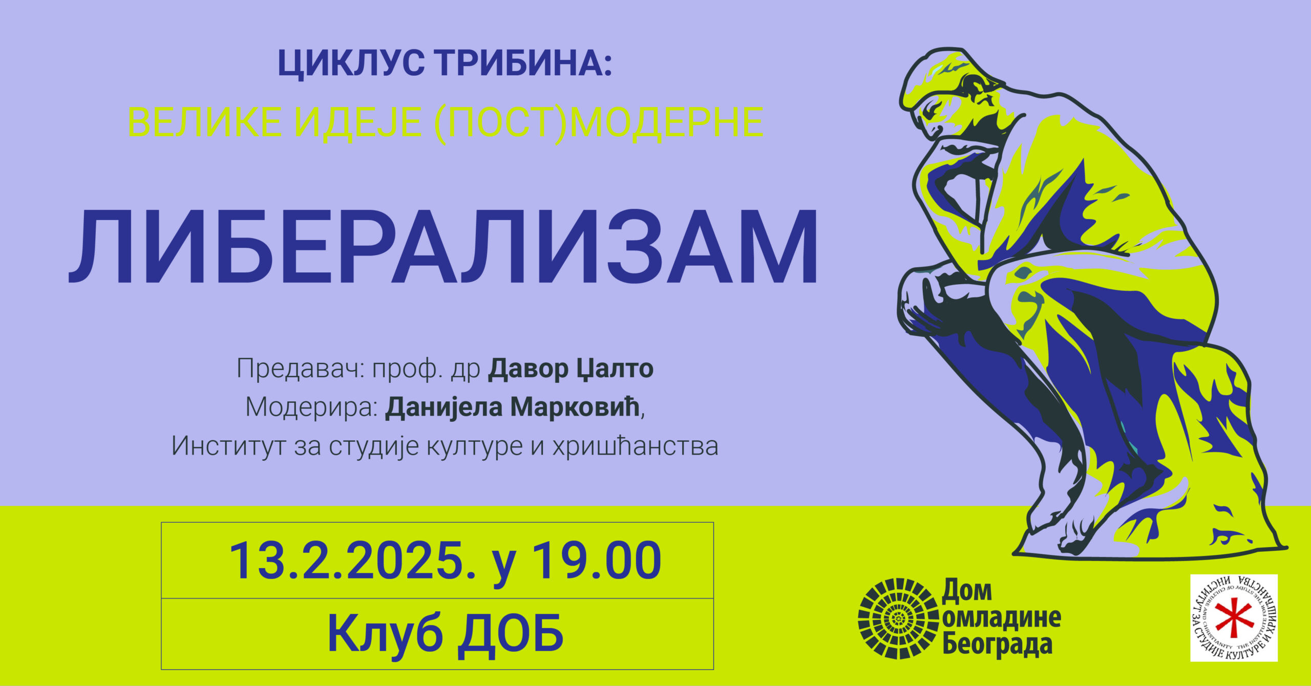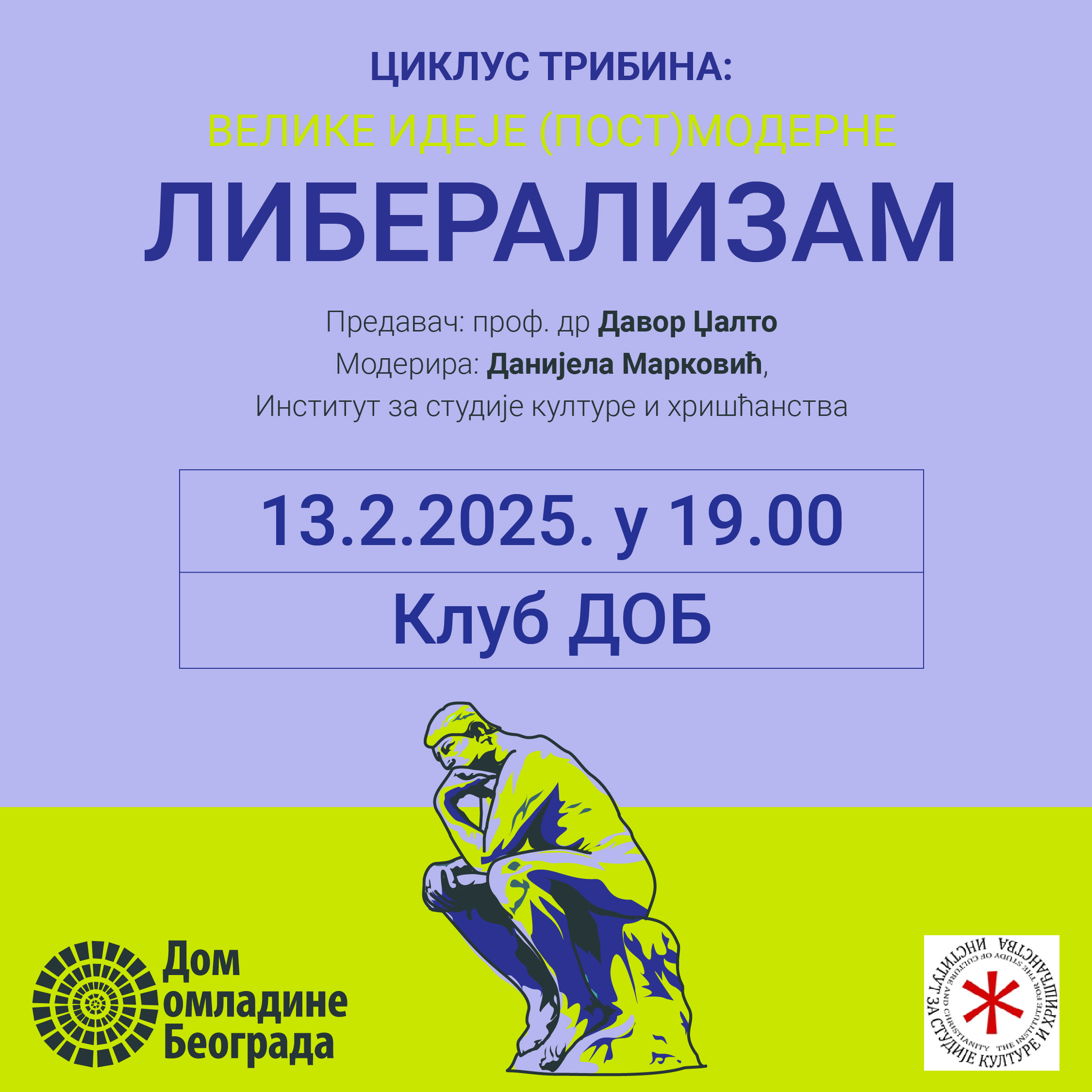 Nastavljajući tematizaciju značajnih knjiga i ideja, Dom omladine Beograda i ISKH realizovaće novi ciklus tribina, „Velike ideje (post) moderne“ posvećen nekim od najznačajnijih koncepata zapadne moderne i postmoderne, koji ostaju značajni i u današnjem svetu globalizacija različitog tipa. Svaka od „velikih ideja“ je analizirana na bazi nekih od ključnih tekstova koji su formirali, objasnili ili značajno unapredili te ideje, i koji ostaju nezaobilazni za njihovo razumevanje u konkretnom kulturnom i istorijskom kontekstu.