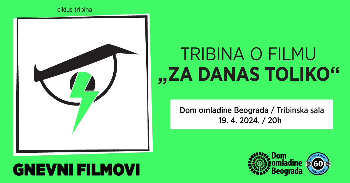 Ciklus tribina „Gnevni filmovi“ u Domu omladine Beograda nastaviće se i u aprilu; u žiži aprilskog izdanja tribine biće već sada zapaženi i voljeni srpski film „Za danas toliko“ scenariste i reditelja Marka Đorđevića. Ovaj film je premijeru imao zimus – u Glavnom takmičarskom programu ovogodišnjeg FEST-a, gde je ovenčan sa dva festivalska priznanje (nagradom za Ivanu Vuković, za najbolju žensku ulogu, i Nagradom lista „Politika“ za najbolji srpski film). U bioskopsku distribuciju u našoj zemlji „Za danas toliko“ je ušao 28. marta.