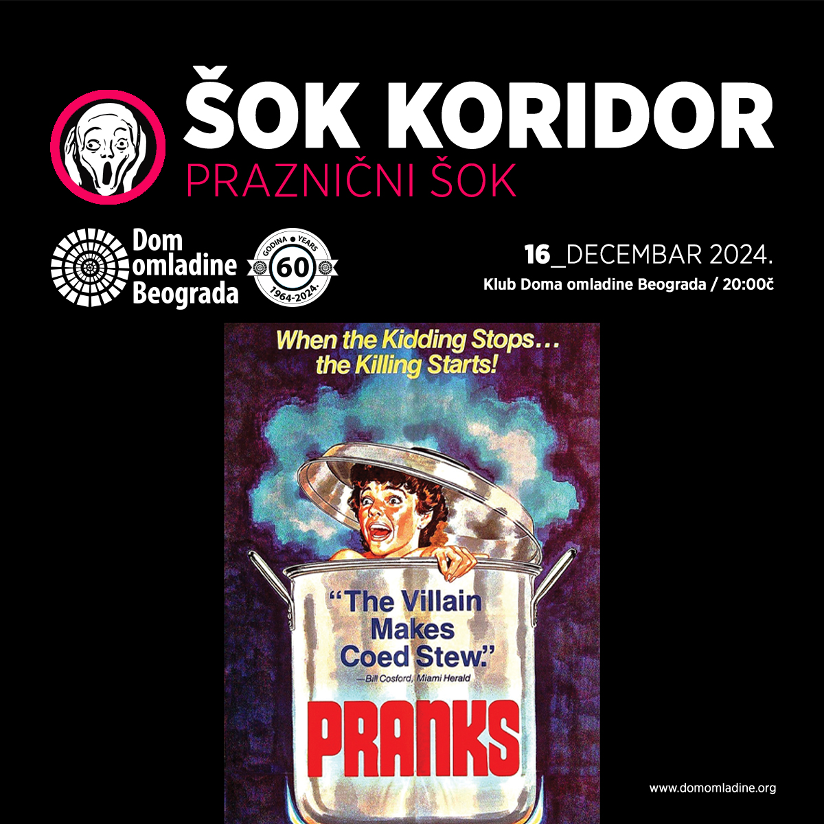 Poslednja tribina ove godine biće održana malo pre novogodišnjih praznika, tako da je red da temu posvetimo ovom prazničnom raspoloženju. Ne brinite, za razliku od svih koji ovom prilikom puštaju razne vesele filmove, Šok Koridor uvek nudi onu mračnu alternativu. Možda ona nekome i nije tako mračna. Prošetaćemo se kroz svetsku kinematografiju i pronaći za vas inserte iz filmova čiji su autori prazničnu atmosferu obojili uglavnom u krvavo crveno. Pridružite nam se u istraživanju PRAZNIČKOG ŠOKA!