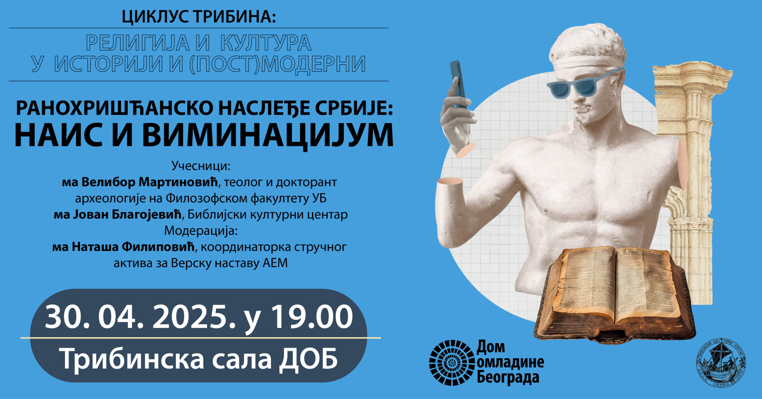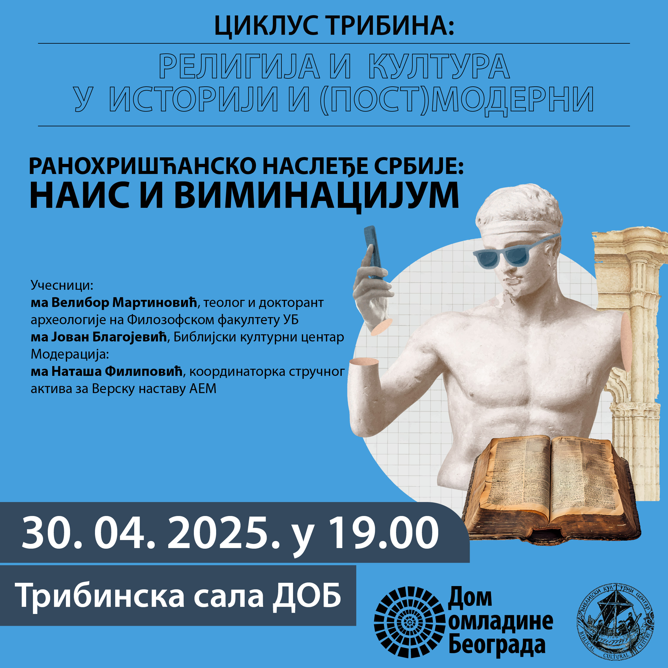 Nakon nekoliko uspešnih ciklusa tribina koje je Dom omladine Beograda realizovao u saradnji sa Biblijskim kulturnim centrom, a u okviru kojih smo se iz različitih uglova i vidovima međusobnog prožimanja, bavili temamama religije, civilizacije, kulture i istorij, tokom 2025. godine nastavljamo sa razmatranjem ovih oblasti. Kroz ciklus tribima “Religija i kultura u istoriji i (post)moderni” postavljamo šira pitanja: šta znači živeti u vremenu kada se kultura i religija dovode u pitanje, kada se tradicionalne vrednosti preispituju, a novi izazovi zahtevaju sveže odgovore? Možemo li iz iskustava prošlosti izvlačiti smernice za budućnost, i na koji način istorijske ideje mogu da inspirišu rešenja za savremene dileme? Savremeni svet karakteriše prefiks post-, tako da živimo u post-hrišćanskom svetu, post-(post) modernom dobu, a možda i post-kulturnom. I kultura i religija se suočavaju sa brojnim, često i zajedničkim izazovima sveta u kojem su se dugo podrazumevale, ali koji ih sve više doživljava kao suvišne ili čak strane faktore. Da li istorijsko iskustvo može da nam pomogne da u postmodernom svetu nađemo obrazac koji će religiji i kulturi obezbediti mesto i mogući uticaj?