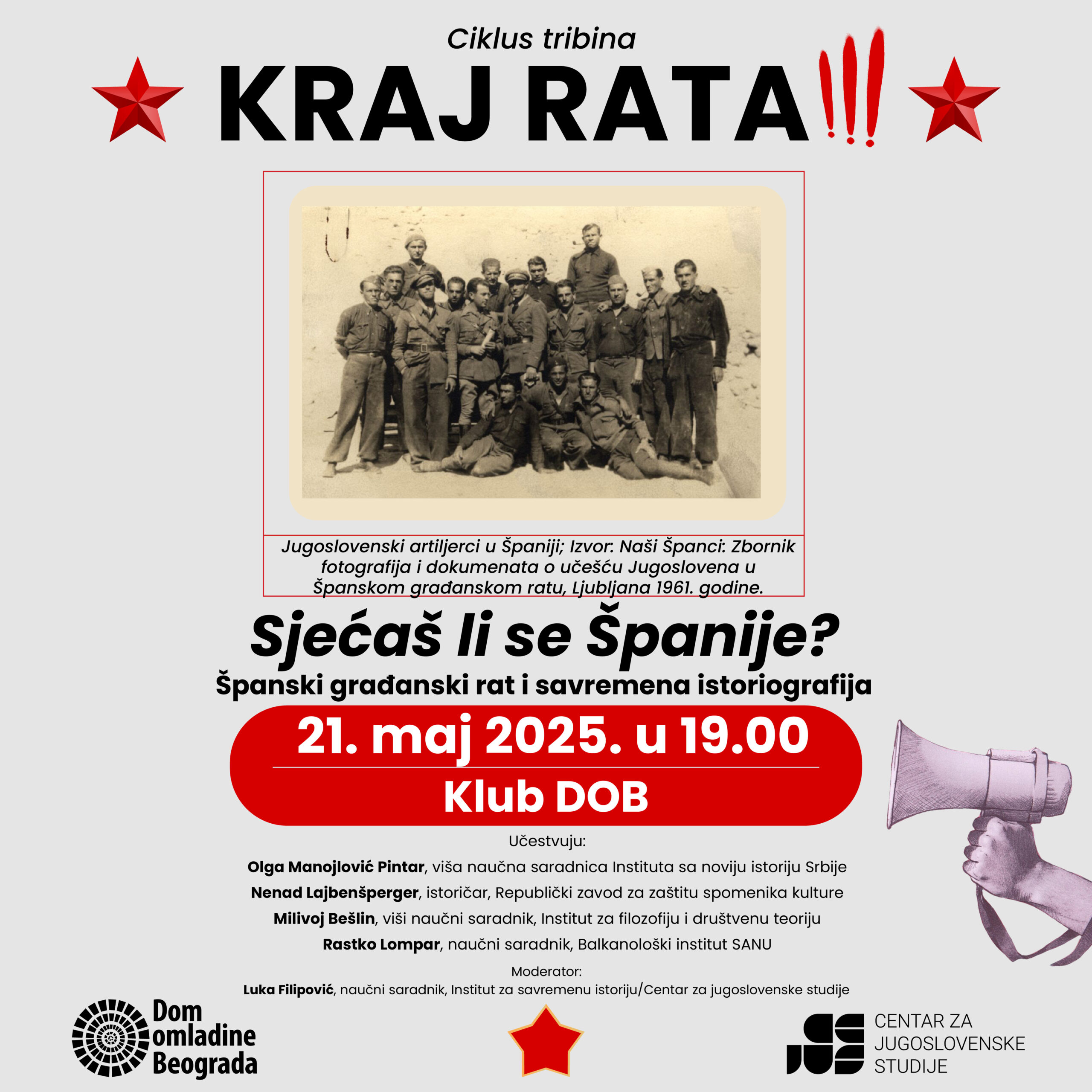 Tribina Sjećaš li se Španije? Španski građanski rat i savremena istoriografija posvećena je ulozi jugoslovenskih dobrovoljaca u Španskom građanskom ratu (1936-1939), uticaju ,,španskog pitanja” na unutrašnja previranja u Jugoslaviji i u drugim državama Evrope, kao i na odnose partija Međunarodnog radničkog pokreta. Takođe, cilj ove tribune je pružanje kritičkog osvrta na poziciju Španskog građanskog rata u jugoslovenskoj (i srpskoj) kulturi sećanja i u istoriografiji. Šta smo to sve nekada znali, pa zaboravili, o ratu koji je pokazao senke mnogih novih fenomena sa kojima će se čovečanstvo suočiti tokom Drugog svetskog rata? Šta možemo naučiti iz prvog velikog ,,Armagedona” ideologija? I kakva je u svemu tome bila uloga Jugoslovenske države, njene vlasti i njene komunističke partije. Kakvog je traga ,,špansko iskustvo” ostavilo na jugoslovensku kulturu, umetnost i književnost? Kako smo pamtili internacionalne brigade u socijalističkoj Jugoslaviji, a kako ih se sećamo danas? Ako se sećamo Španije…