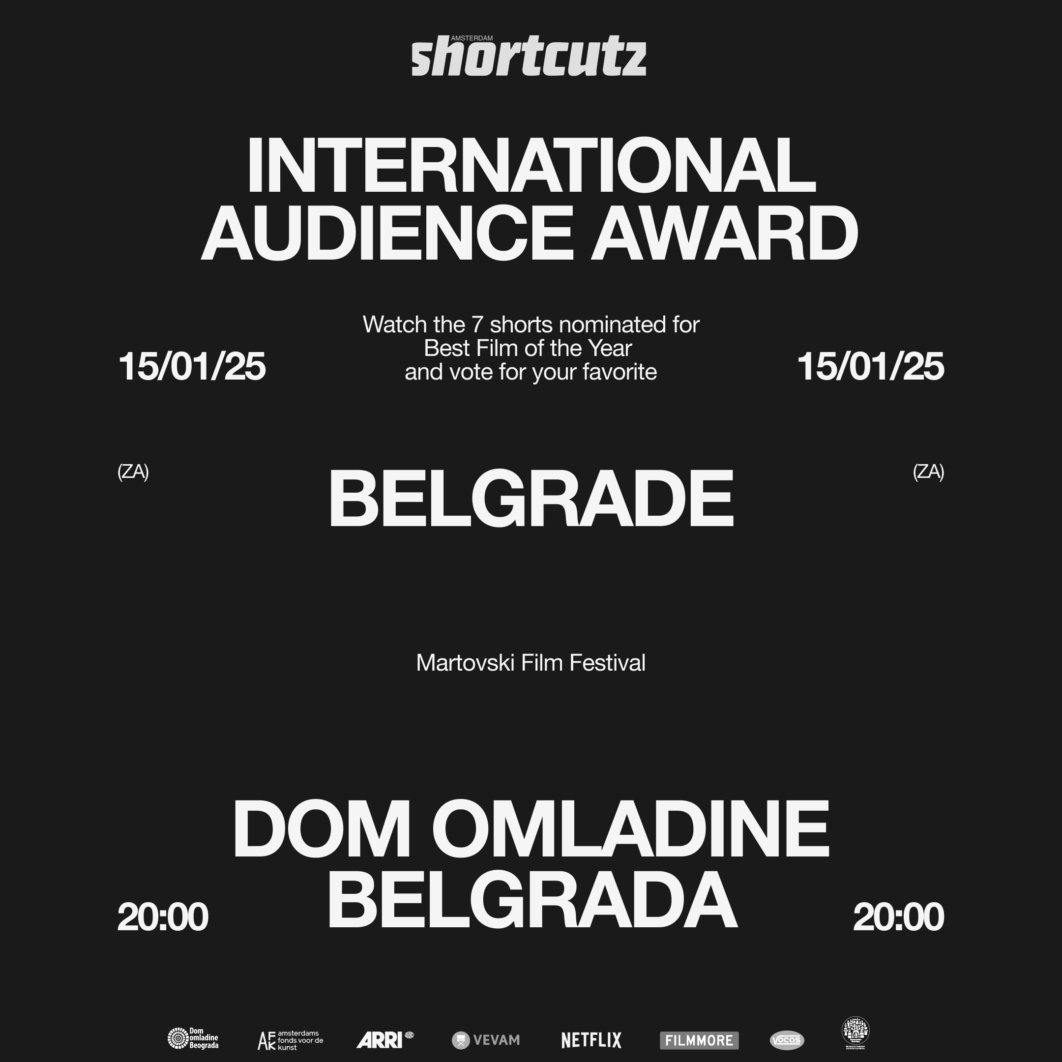 U susret 72. Martovskom festivalu, Dom omladine Beograda predstavlja publici izbor filmova platforme “Shortcutz Amsterdam“, jedine inicijative u Holandiji koja se isključivo fokusira na promociju novih holandskih filmskih talenata i povezuje ih sa profesionalcima iz drugih država.