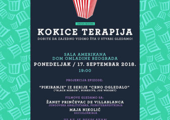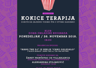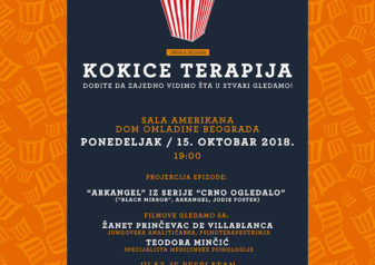KOKICE TERAPIJA je mesečni program Doma omladine koji se odvija drugu godinu za redom i trajaće od 17. septembra do 17. decembra 2018. godine. Program podrazumeva gledanje filma, potom razgovor o istom kada se upali svetlo, s predavačima koji su renomirani psihoterapeuti različitih škola i pravaca, sociolozi, reditelji, dramaturzi, umetnici.