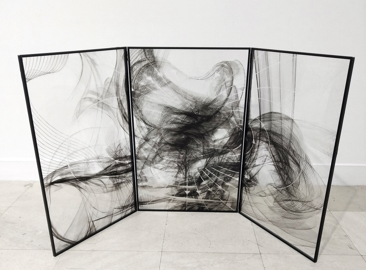 Anja Tončić: Kao što je koleginica sa ITP-a, Isidora H., primetila o mom radu pri pisanju teksta za prateći katalog izložbe kao neko ko je teoretski fizičar, a ne istoričar umetnosti, u svojoj praksi nakon dugog perioda jakog kolora i reljefnih pastuoznih formi koristim monohromatsku skalu, koja kreira međuodnose svetlosnih vrednosti, slične onima koje u muzici poznajemo kao kompoziciju u akustičnim relacijama; to jest, sastav univerzalnih sistema, nezavistan od jednog narativa, dogmatizma, deskripcije ili spektakla materijalnih usiljenosti. Stoga, redukcija u samom tehničkom manevru je postala nužna pri potrebi prikaza i prenošenja procesa kao što su ritam, oscilacija i svetlost. Ranije insistiranje na mahom izvorno uljanim bojama već nekoliko godina zamenjujem na stalnom uobličavanju i razobličavanju crtačkog procesa baziranom na čistom pigmentu (copic ink refillers uglavnom) razređenom alkoholima i medijumom poput Liquin-a da bih dobila suptilne gradacije na papiru i platnu koje su poput tehnike izmenjenog akvarela ali bez razarajućih i nestalnih komponenata vode.
