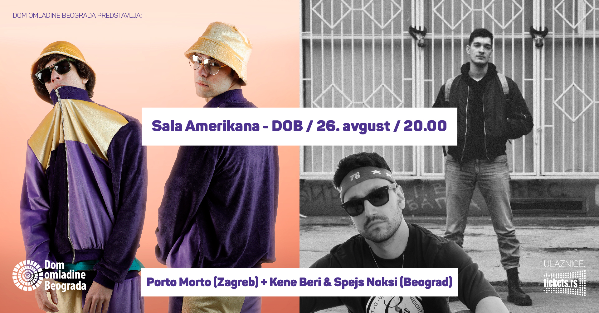 Kene Beri i Spejs Noksi su novi majstori izazovnih muzičkih ludorija dugih beogradskih noći, a slušamo ih u tandemu 26. avgusta u Amerikani, na velikoj gradskoj žurci u organizaciji Doma omladine. Pored njih, publiku očekuje i nastup benda Porto Morto iz Zagreba. Ulaznice su u pretprodaji po ceni od 800 rsd na blagajni Ticket Vision u Domu omladine Beograda.
