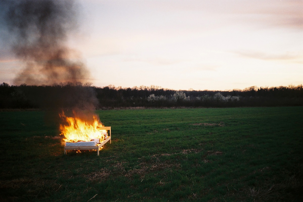 Na izložbi su predstavljena tri rada: na instalaciji je prikazana devojka koja spava, dok je ispred postavljen video na kome, za to vreme, krevet gori. Na drugoj strani Galerije se nalazi video dokumentacija u kojoj klizačica u vatrogasnom odelu vozi rolere. Kako biste opisali ovu narativnu celinu?