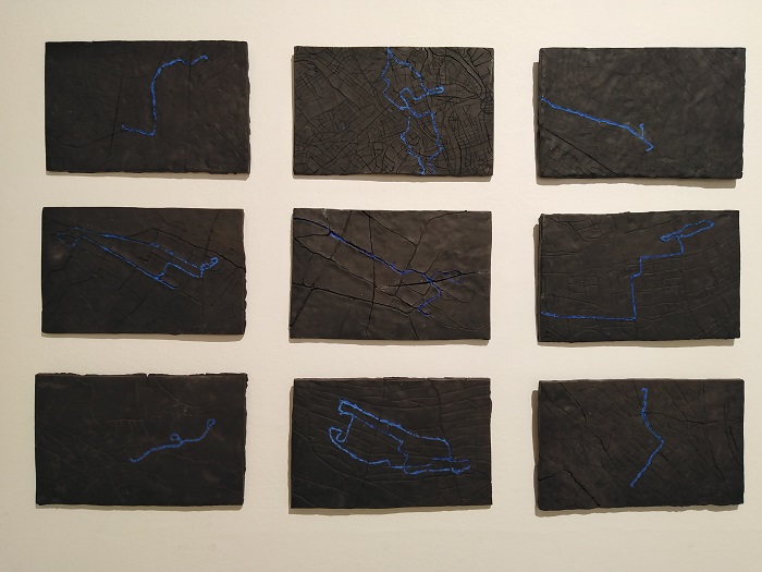 ’’Gde sam bila, šta sam radila’’ su nastale u jednoj radionici na Novom Beogradu, dok sam šmirglala 3D printove za neku svemirsku stanicu. Tada su nastale u mojoj glavi, pa sam ih stavila na papir kada sam konkurisala za termin za izložbu. Napravila sam ih pred ovu izložbu, i one su tačan prikaz mojih skorašnjih kretanja, ali bez pisanih legendi sa strane. I već sada hvatam sebe da ne mogu da se setim gde sam to bila i šta sam radila na dve od devet tablica. Trebalo je da zapišem.