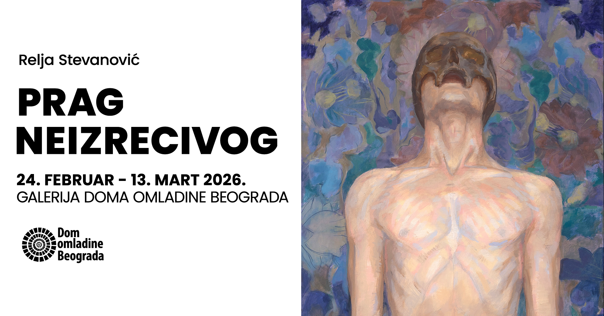 U Galeriji Doma omladine Beograda do 13. marta otvorena je izložba slika „Prag neizrecivog“ Relje Stevanovića, koji je student Fakulteta likovnih umetnosti u Beogradu, gde trenutno pohađa doktorske studije. Pored dve osvojene nagrade, ima i značajno izlagačko iskustvo. Postavka radova, iako različitih formata, ostavlja utisak sklada, ravnoteže i mere.