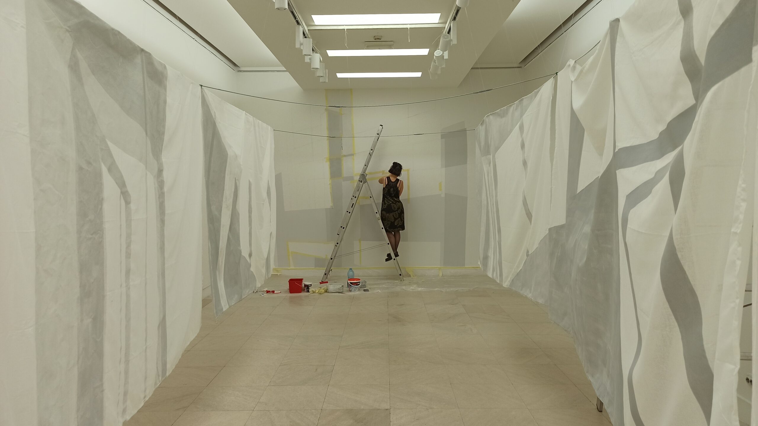 Sofija Vojinović: Taj utisak o brzini prolaženja vremena i međusobni uticaj vremena i prostora jeste, kao što je navedeno u pitanju, tema koja večito traje i koja puno toga može obuhvatiti. Pre nekoliko godina, prijatelj mi je poslao citat Plinija Starijeg iz „Istorije prirode“ o počecima slikarstva: da je davno nastalo iz običaja da se čovekova senka zaokruži linijom. Jedan deo izložbe čini rad na zidu, koji će po završetku ove izložbe biti prekrečen. Produžavam trajanje određenog trenutka, ali ga ne uskraćujem prolaznosti i nestajanja. Na oslikana platna, koja su zidovi umanjene galerije, utiču i položaji i kretanje ljudi prisutnih u prostoriji, pa i ti njihovi obrisi počinju da se preklapaju sa naslikanim senkama. Uspomene, sećanja i načini na koji pamtimo se menjaju, pa samim tim nekad utiču i na drugačije percipiranje.