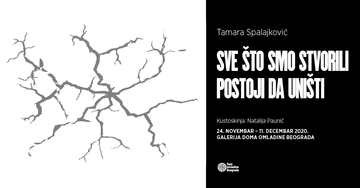 Izložba Tamare Spalajković “Sve što smo stvorili postoji da uništi”, otvorena je u Galeriji Doma omladine Beograda do 11. decembra 2020. godine. Kroz video rad, umetnica prikazuje unutrašnje stanje koje kroz dalje sagledavanje postaje kolektivna psihološka distorzija misli i osećanja, uslovljena distopičnom svakodnevicom. Smenjivanjem vriska i teksta, koji u toku trajanja projekcije izgovara, Spalajković navodi na razmišljanje o tenzijama unutar društva i posledicama koje fluidnost spoljnjeg sveta ostavlja na pojedinca. Upravo ta razmatranja dovode u pitanje poziciju umetnosti, ali i načine borbe za ličnom egzistencijom.