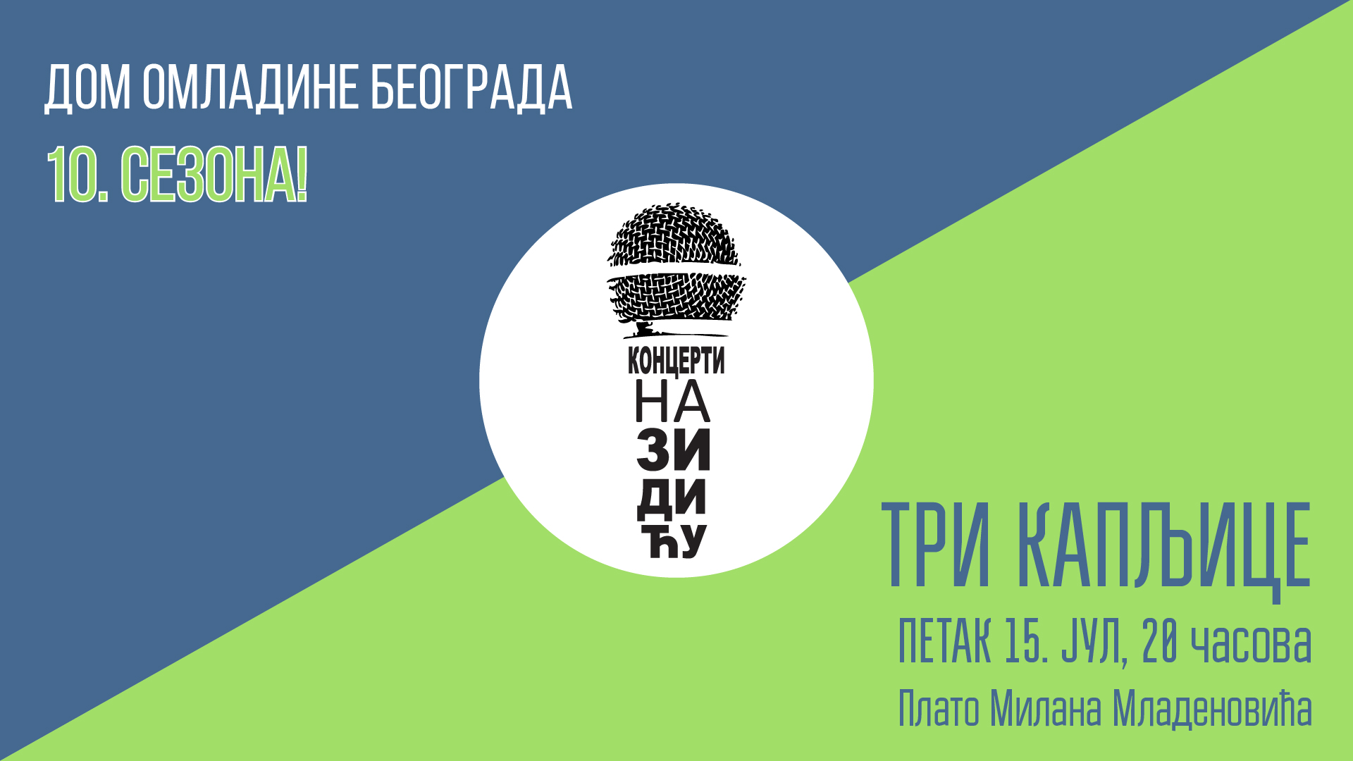 Tri Kapljice su dinamična rokenrol skupina iz Novog Sada, nastala 2007. godine. Ova bučna trojka, pored brojnih nastupa kako pred festivalskom, tako i pred klupskom publikom, ima iza sebe album sa pređašnjom postavom – “Girls are Back“, a spotom Surfin’ su najavili svoj novi EP “Brzo, brzo!” Inspiracija su im različiti muzički pravci i periodi, a muzika koju stvaraju je melodična i glasna. Publika će imati priliku da ih čuje na Platou Milana Mladenovića 15. jula od 20:00, u sklopu desete sezone Koncerata na Zidiću u organizaciji Doma omladine Beograda.