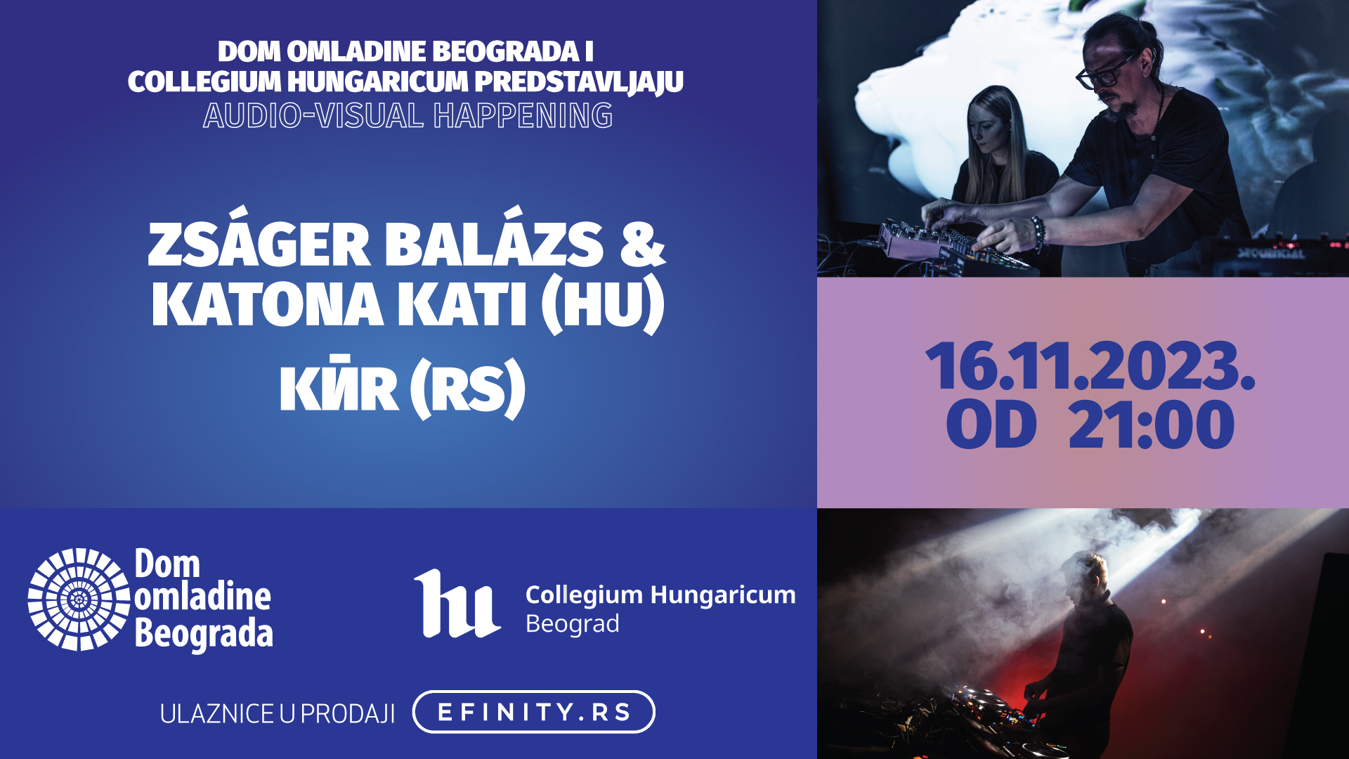 Beogradska publika će 16. novembra od 21 sat u Domu omladine doživeti nesvakidašnje audio-vizuelno iskustvo: magiju svetlosti i zvuka uz primamljive vizuelne efekte predstaviće mađarski umetnici Žager Balaš & Kati Katona, u saradnji sa srpskim umetnikom Kӣrom. Žager Balaš je klavijaturista i producent vodećeg mađarskog elektronskog projekta Žagar. Njegov debi album „Local Broadcast“ uvršten je u 50 najvažnijih mađarskih albuma svih vremena, po izboru časopisa Wan2Magazine.