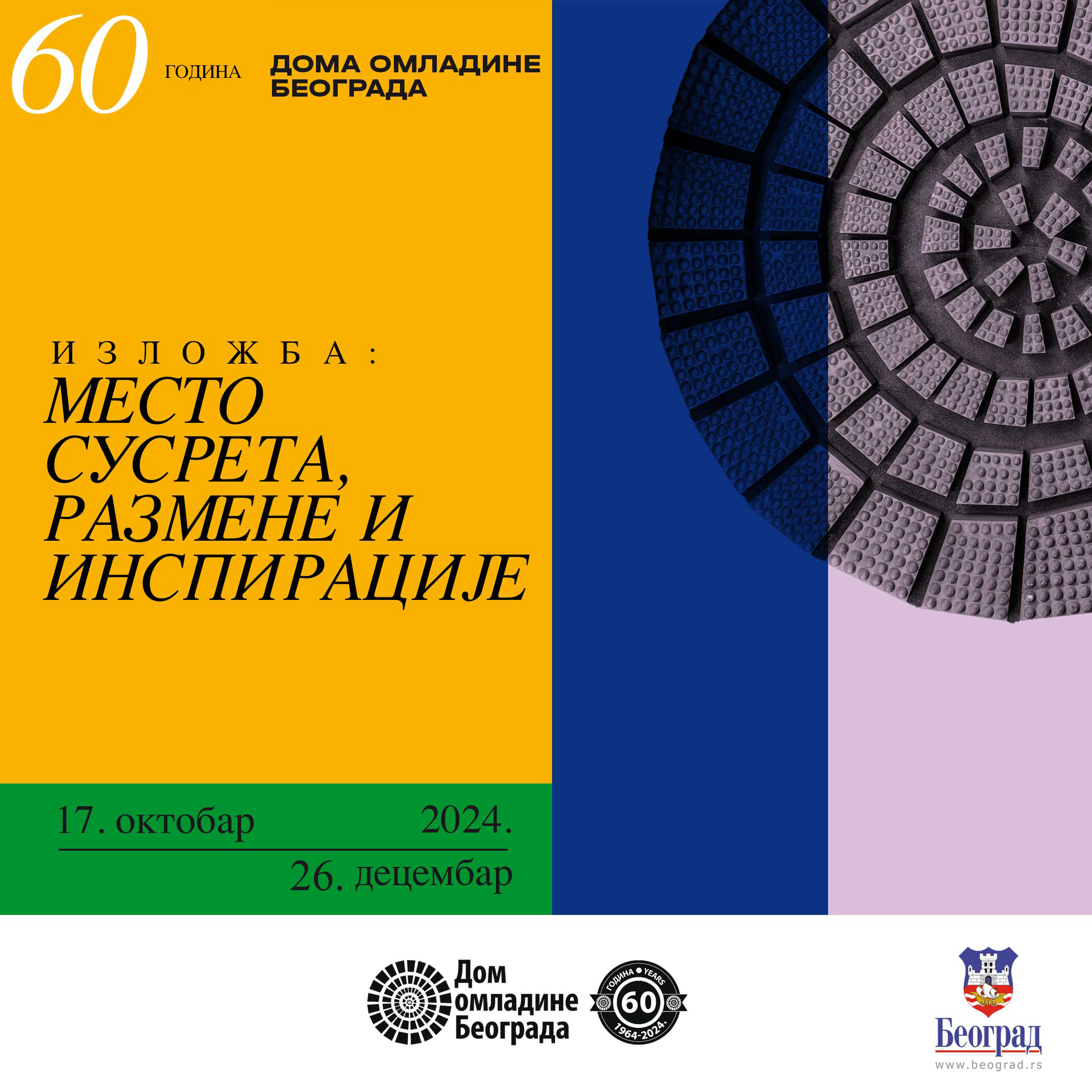 Izložba „Mesto susreta, razmene i inspiracije – Dom omladine Beograda 1964 – 2024.“ koncipirana je sa idejom da pruži sveobuhvatni uvid u raznovrsnost i bogatstvo programskih aktivnosti DOB-a, bez tendencije ka hronološkom pripovedanju i valorizaciji njenih aktivnosti, već sa željom da se predstavimo onako kako i sami sebe doživljavamo, kao mesto susreta, razmene i inspiracije.
