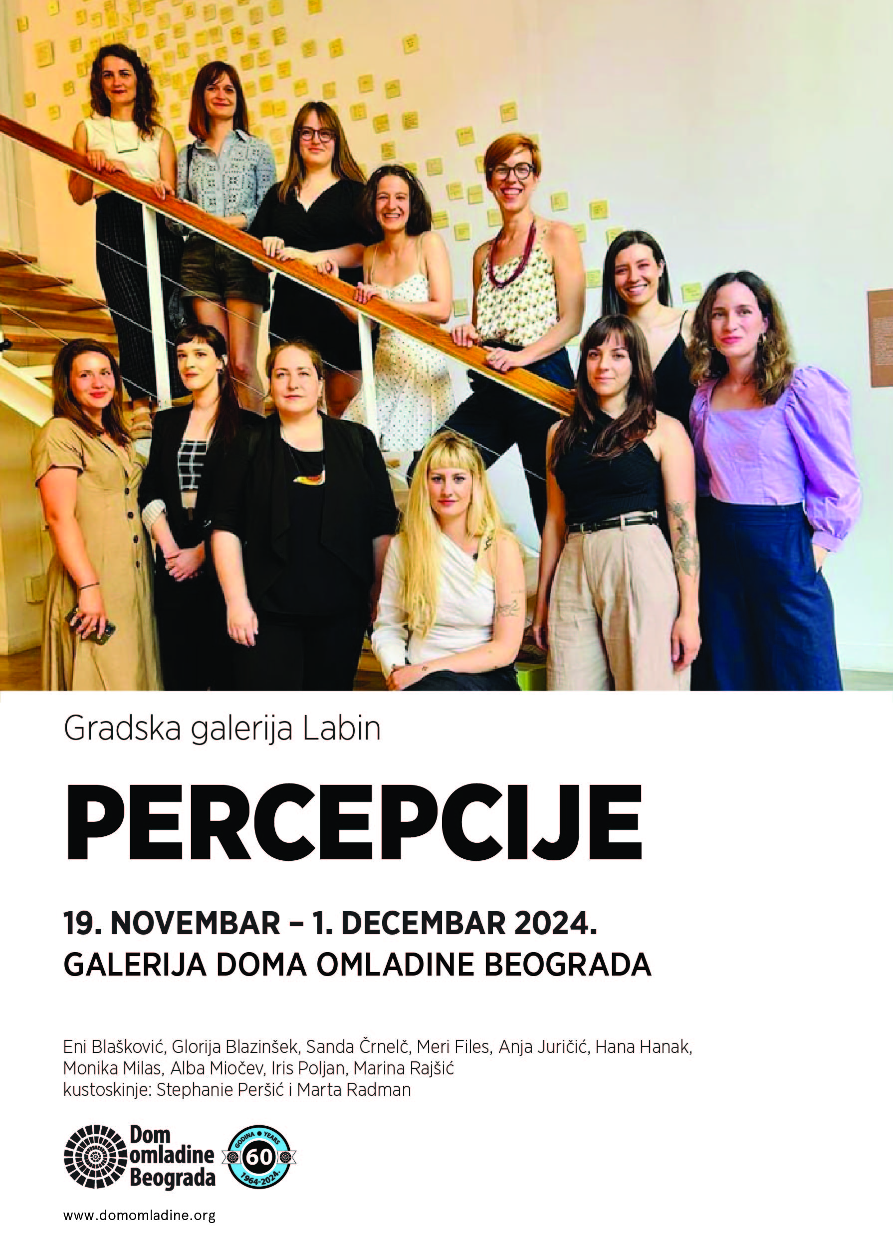 U Galeriji Doma omladine Beograda, od 19. novembra do 1. decembra, posetioci će biti u prilici da se upoznaju sa radom Gradske galerije Labin iz Hrvatske, koja ovom prilikom, a pod vođstvom kustoskinja Stephanie Peršić i Marte Radman, predstavlja sledeće umetnice iz Zagreba i Labina: Eni Blašković, Glorija Blazinšek, Sanda Črnelč, Meri Files, Anja Juričić, Hana Hanak, Monika Milas, Alba Miočev, Iris Poljan i Marina Rajšić.