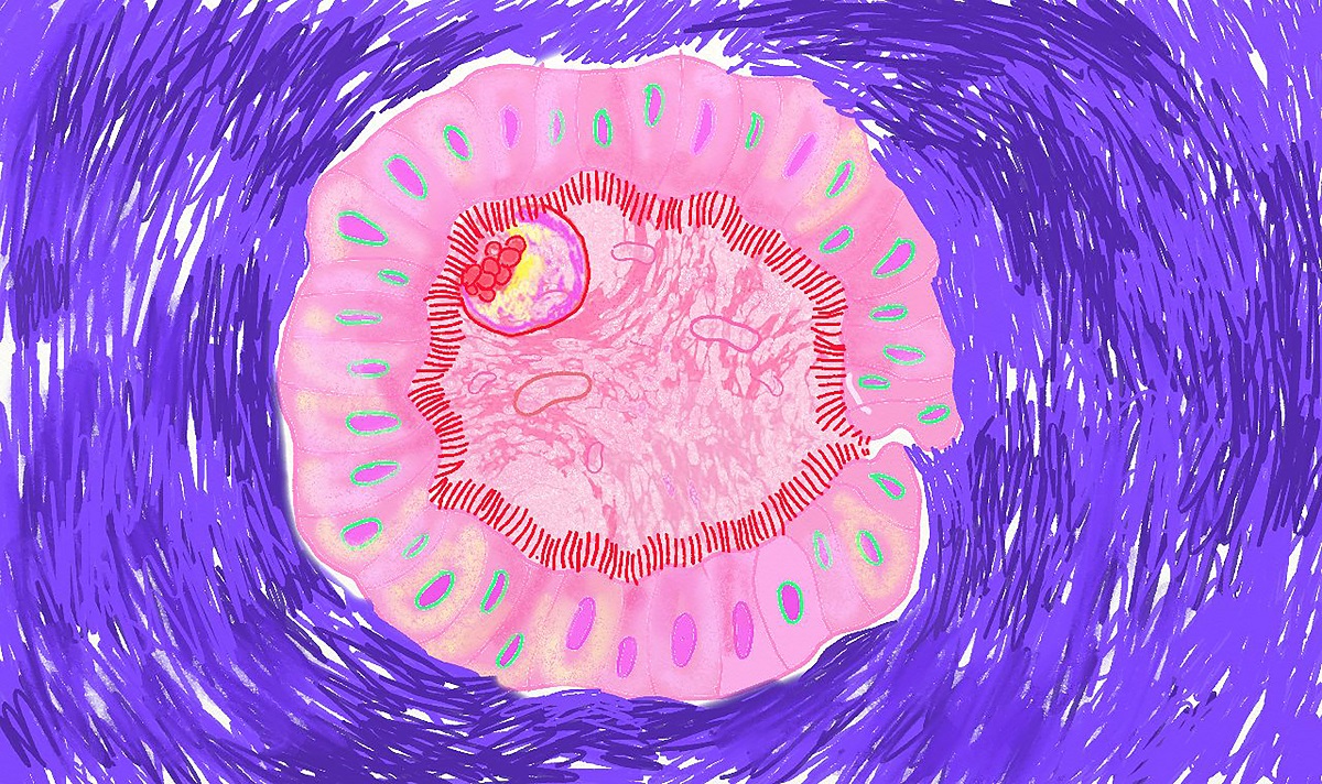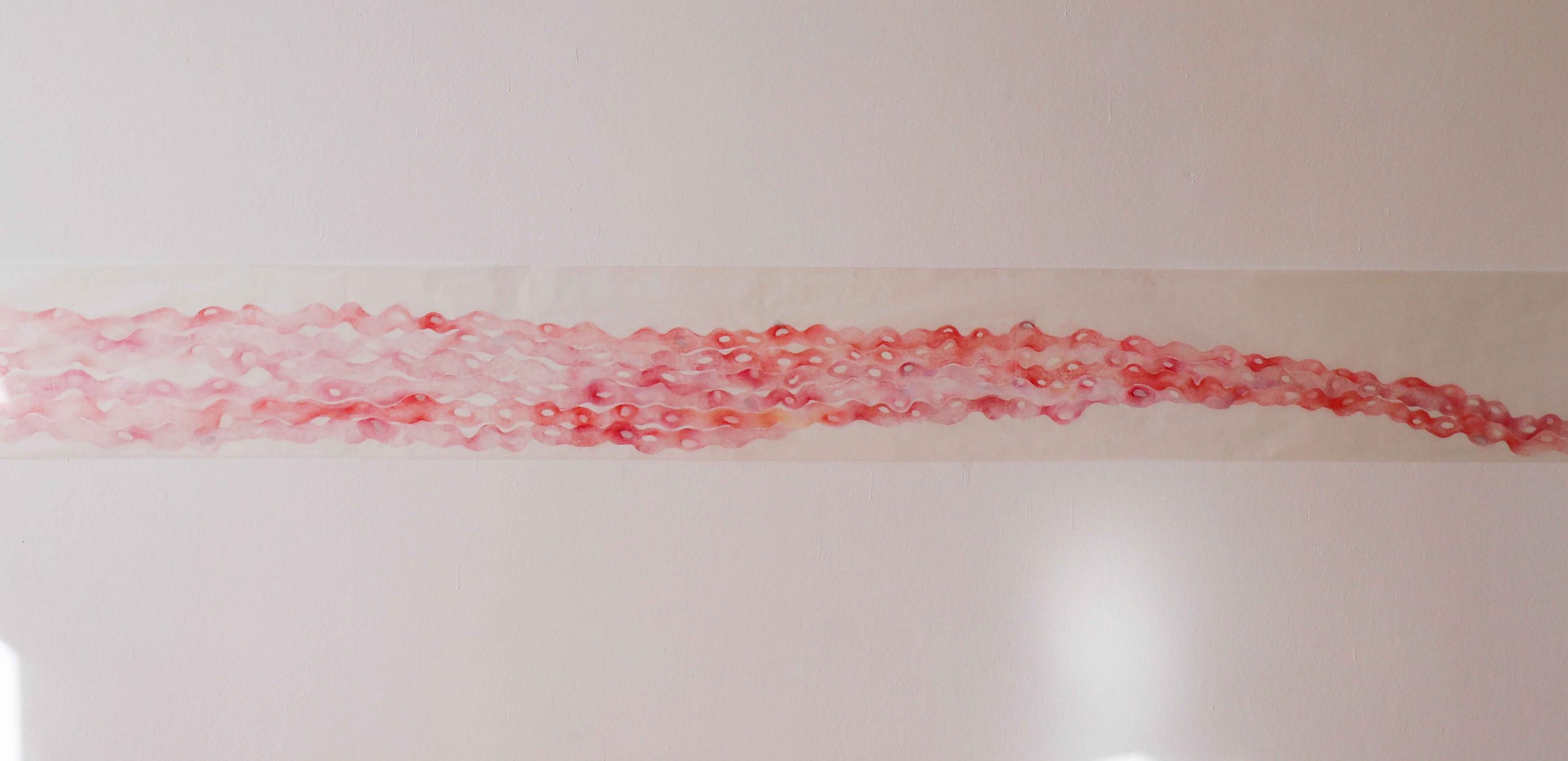 “Zahvaljujući specifičnostima izložbenog prostora, došli smo do tačke u kojoj ne vidimo samo umjetnost, već prostor sjedinjen sa izloženim djelima. Spoljašnji svijet ne smije da ulazi u galeriju; nema prozora, sve je zapečaćeno kako bi se stekao utisak koherentnosti i jedinstva. Upravo zbog ovih karakteristika, galerija se može posmatrati kao organ koji samostalno funkcioniše. Podijeljeni crtežom „Ni iznutra ni spolja“, zidovi galerije postaju „prokrvljeni“ roze bojom membrane materice koja ima težnju za proliferacijom. Crtež svojom dužinom i dinamikom upućuje na bespočetnost materice iz koje se iznova rađaju novi životi. Ovako oživljena površina zida postaje lokus, više nije samo pasivni nosilac umjetnosti, već, takođe, površina galerije pulsira kao tkivo prožeta estetskim silama. Kao da i sama ćelija endometrijumskog tkiva biva gradivna jedinica galerije. Rasklopljena materica se rasteže u svojoj fluidnosti između nebića i bića, onostranog i ovostranog. Dok teče i mijenja se, označava mjesto prolaska između dva svijeta. Ona postavlja pitanje spoljašnjeg i unutrašnjeg: da li površina zida s jedne strane ovog crteža pripada nevidljivom koje još nije prodrlo u tkivo, ili pak, pripada materijalnom, ovozemaljskom svijetu koje počinje svoje razviće dospjevši u uterus.