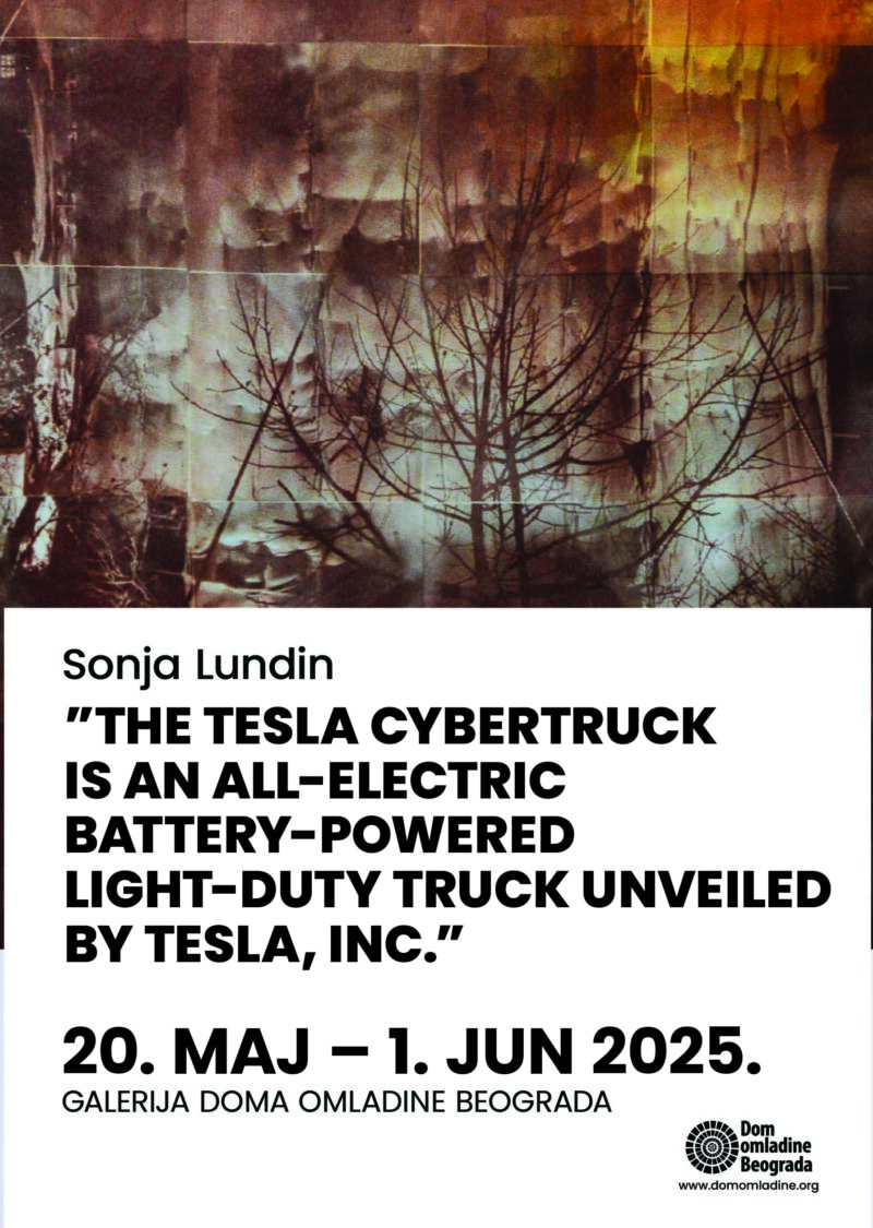 Izložba Sonje Lundin pod nazivom „The Tesla Cybertruck Is an All-Electric Battery-Powered Light-Duty Truck Unveiled by Tesla, Inc.” u Galeriji Doma omladine Beograda traje u formi „žive izložbe“ od 20. maja do 1. juna, dok će svoju rekonstrukciju imati 30. maja sa početkom u 19.00 sati.