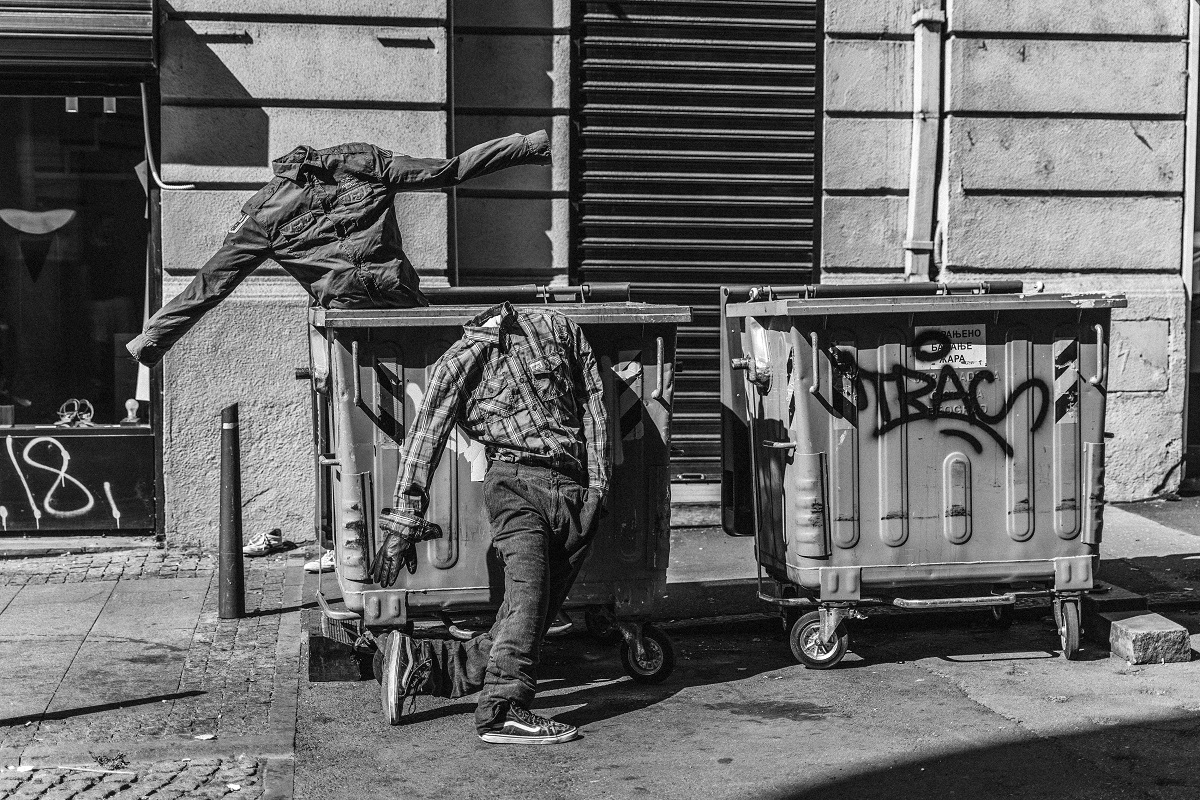 Čovek-lutka koju Obrad Ćešić, master vajarstva iz Beograda, ispituje u seriji radova nastalih između 2022. i 2023, postavljajući antropomorfne figure prirodne veličine u različite prostorne kontekste, ovom prilikom zakoračuje natrag u izlagačku postojbinu umetnosti 20. i 21. veka – white cube. To nije predstava jednog određenog čoveka, budući da portret nedostaje (glave nema ili je prekrivena belom krpom), niti jedne klase, rase, epohe, zanimanja, jer mu je nadenuto ruho dovoljno generično da ga može nositi bilo ko (mada se uniformom povremeno transformiše u predstavnika organa reda). Nije ni studija forme – konture tela jedva da se pomaljaju iz šljampave odeće. To je, rečju, objekat koji postaje neko i/ili nešto tek dodeljenim mu mestom boravka, u aktivnoj komunikaciji sa okruženjem. Kada je na ulici – satrt uza zid stambene zgrade, polegao na parkovsku klupicu, posađen u kontejner – pretvara se u čoveka-instalaciju bez doma, uznemirujućeg i zbunjujućeg. U halama bivše fabrike on je radnik, kolateralna šteta ratova, tranzicija i privatizacija. Na Likovnoj akademiji on je antipod ljudske figure u kamenu, drvetu, metalu… jasnih ivica, precizne morfologije.