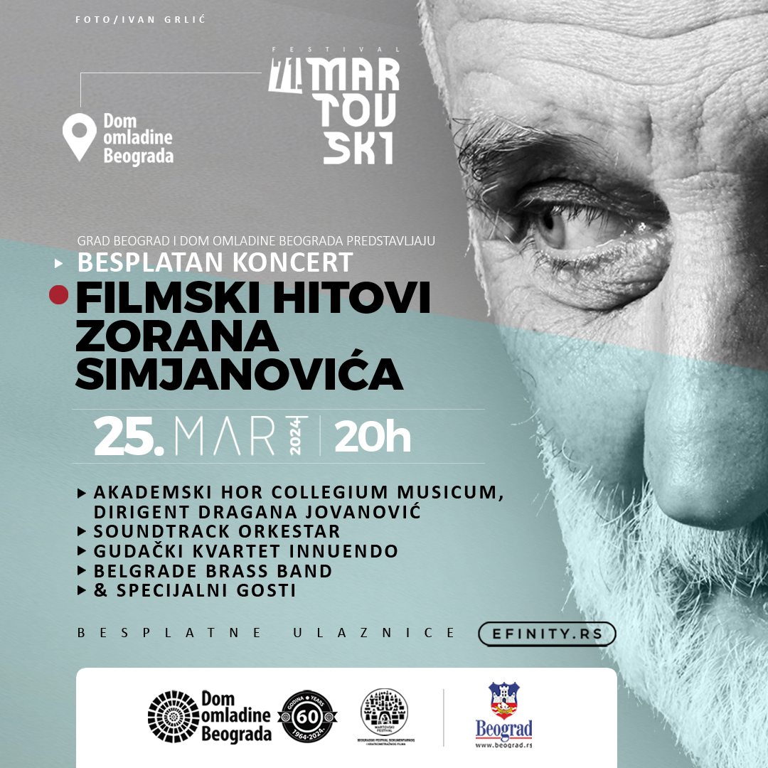 Mart je tradicionalno mesec najstarijeg filmskog festivala u regionu, stalne manifestacije od značaja za kulturu grada Beograda. Za 71. izdanje Martovskog festival, osnivač grad Beograd i organizator Dom omladine Beograda poklanjaju publici jedan izuzetan umetnički događaj: koncert filmske muzike Zoran Simjanovića, posvećen našem najznačajnijem kompozitoru primenjene muzike, kojem je posthumno dodeljena nagrada za životno delo Martovskog festivala pre tri godine.