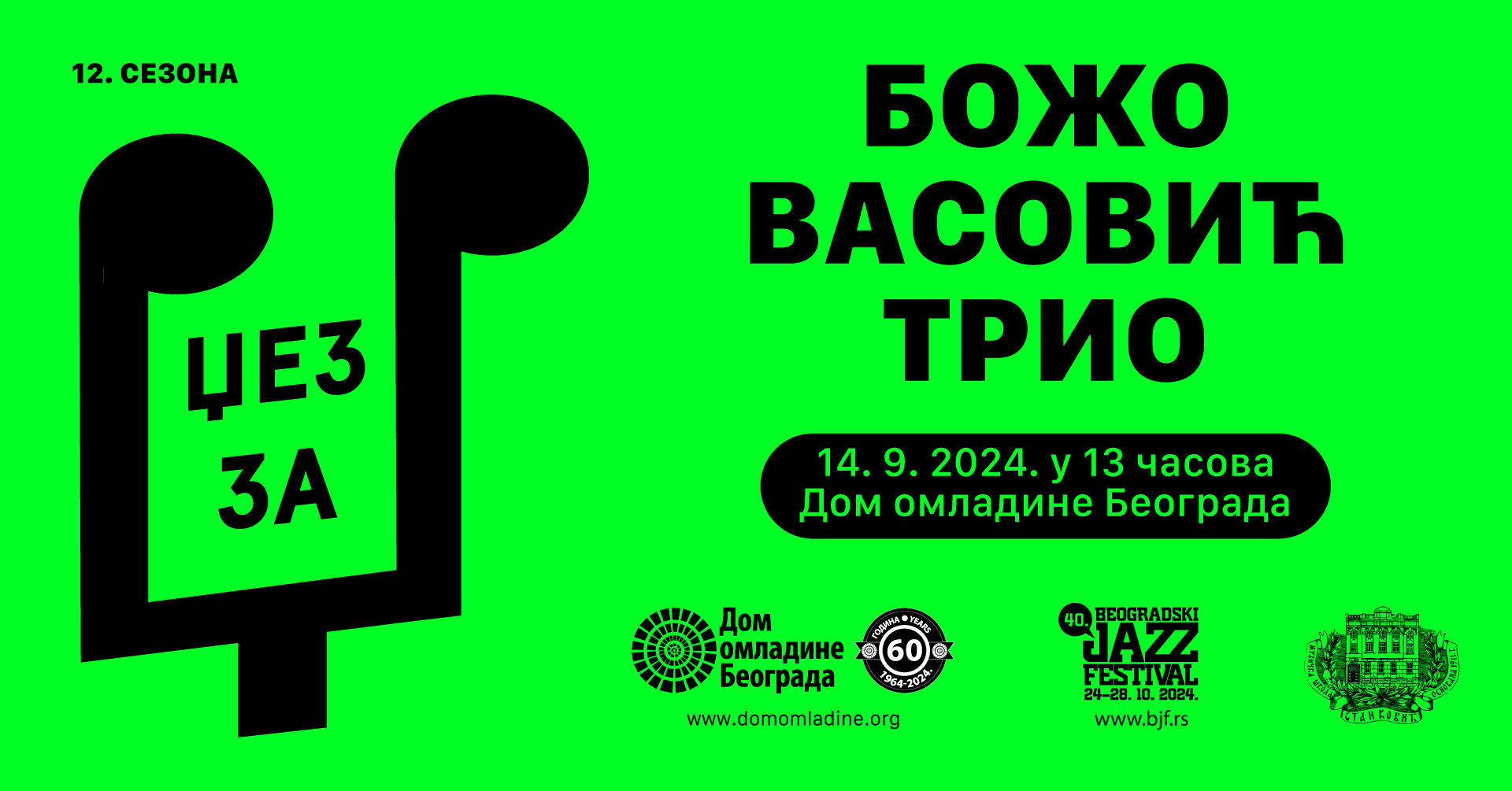 Dom omladine Beograda nastavlja koncept upoznavanja publike za savremenom srpskom džez scenom, kroz serijal besplatnih koncerata “DŽEZ ZA DŽ” koji je započet 2013. godine. Jednom nedeljno, od 7. do 28. septembra 2024. u redovnom terminu matinea subotom od 13 časova, posetioci će, u susret Beogradskom džez festivalu, i ove godine imati priliku besplatno da čuju kvalitetne domaće džez izvođače.
