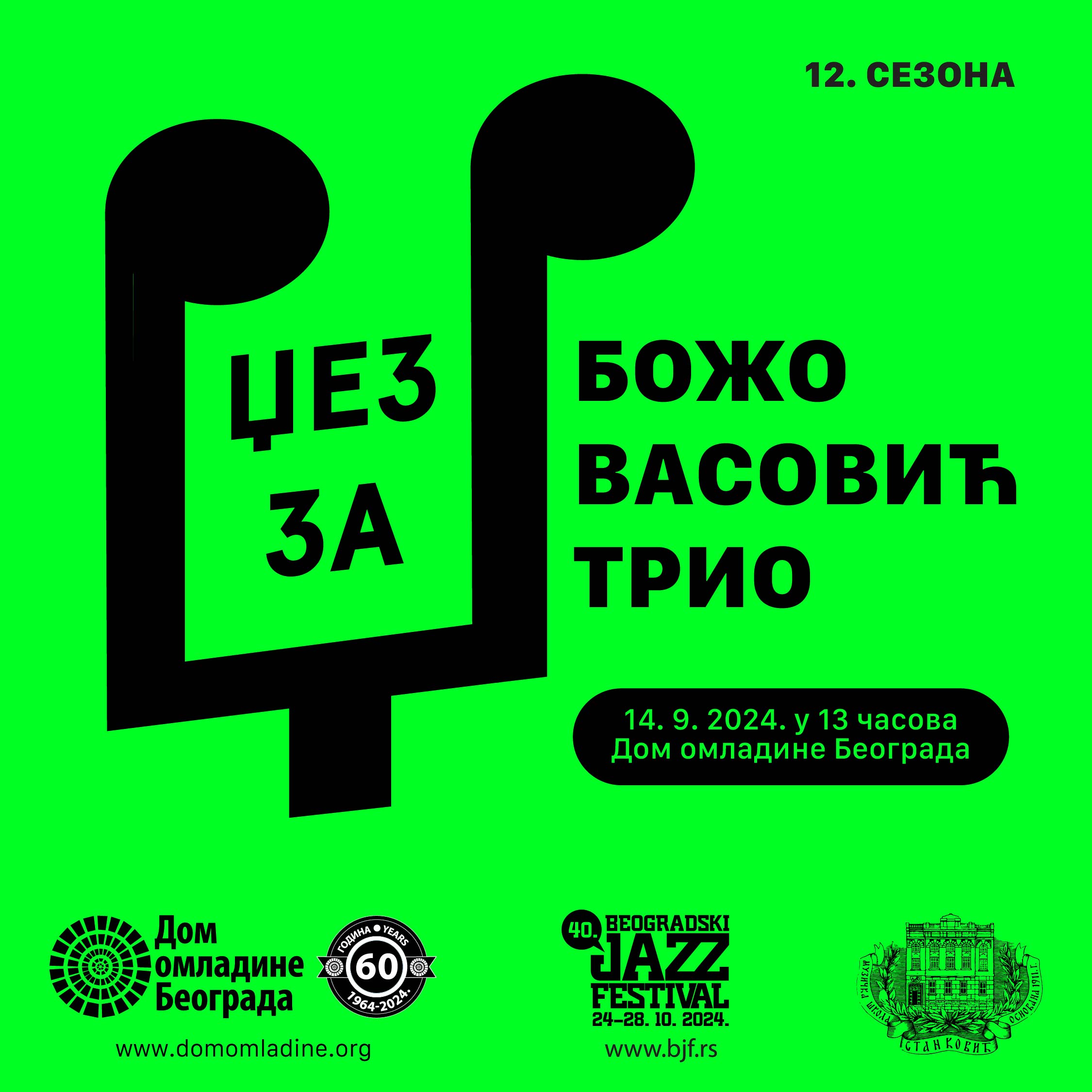 U okviru koncertnog serijala „Džez za DŽ“, subota 14. septembar rezervisana je za nastup učenika džez odseka MŠ „Stanković“. Ove godine publici će se predstaviti trio jednog od najmlađih gitarista na srpskoj džez sceni, nadarenog Boža Vasovića. Posetiocima Doma omladine sviraće autorsku muziku i nekoliko džez standarda u modenim aranžmanima.