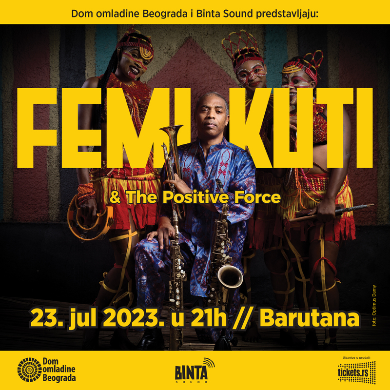 Dom omladine Beograda i Binta Sound predstavljaju veliki koncert: Femi Kuti & The Positive Force! Jedan od najvećih živih afričkih muzičara, svakako najveća zvezda afrobita, višestruko “Grammy” nominovani, ambasador Unicefa, legendarni Femi Kuti ponovo dolazi u Beograd ovog leta!