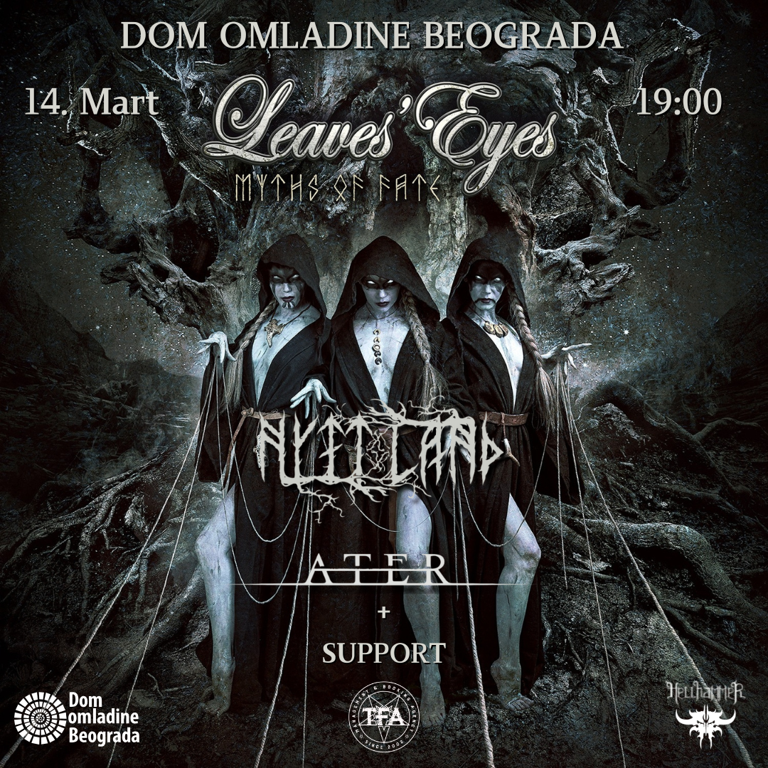 LEAVES’ EYES je uvek bio bend superlativa: međunarodna grupa je obišla pet kontinenata, svirajući koncerte u više od 50 zemalja. Njihovi nastupi uživo su spektakularni događaji sa scenskim pejzažima koji oduzimaju dah. Sa svojim novim albumom „Myths Of Fate“ (broj 17 na zvaničnim nemačkim listama albuma) Leaves’ Eyes ponovo isplovljavaju novim vetrovima koji definitivno duvaju iz surovog plićaka simfonijskog metala. Fantastičan svet legendi iz nordijske i istočnoevropske mitologije je okruženje za monumentalnu zabavu koja nas očekuje i u Beogradu sa specijalnom vikinškom scenografijom.