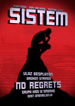 Beogradski bend No Regrets besplatnim koncertom u Domu omladine predstavlja novi spot za pesmu Sistem. Svirka je zakazana za subotu 19. oktobra u klubu Doma omladine sa početkom u 21h. Pored No Regrets, na sceni će nastupiti Broken Strings, Grupa Kiss iz Amerike i specijalni gost iznenađenja.