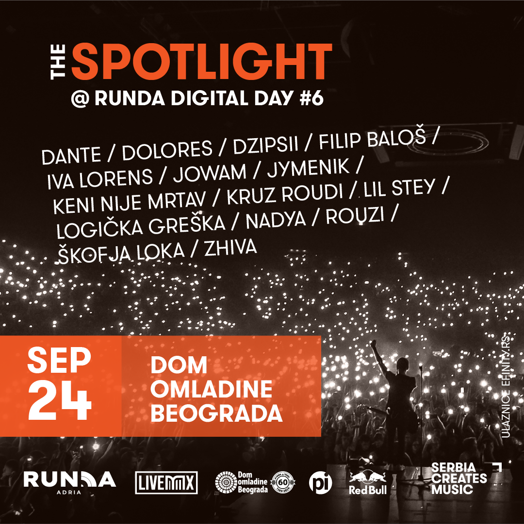 The Spotlight biće održan 24. septembra u Domu omladine Beograda, s početkom u 20 časova, kao zvaničan muzički program u okviru šestog izdanja Runda Digital Day konferencije, koju organizuje Regionalno udruženje nezavisnih diskografa (RUNDA). Na dve bine – u sali Amerikana i u Klubu DOB-a nastupiće više od 15 izvođača, uključujući spotlajtere iz dve generacije pobednika nacionalnog muzičkog konkursa „Serbia Creates: The Spotlight“.