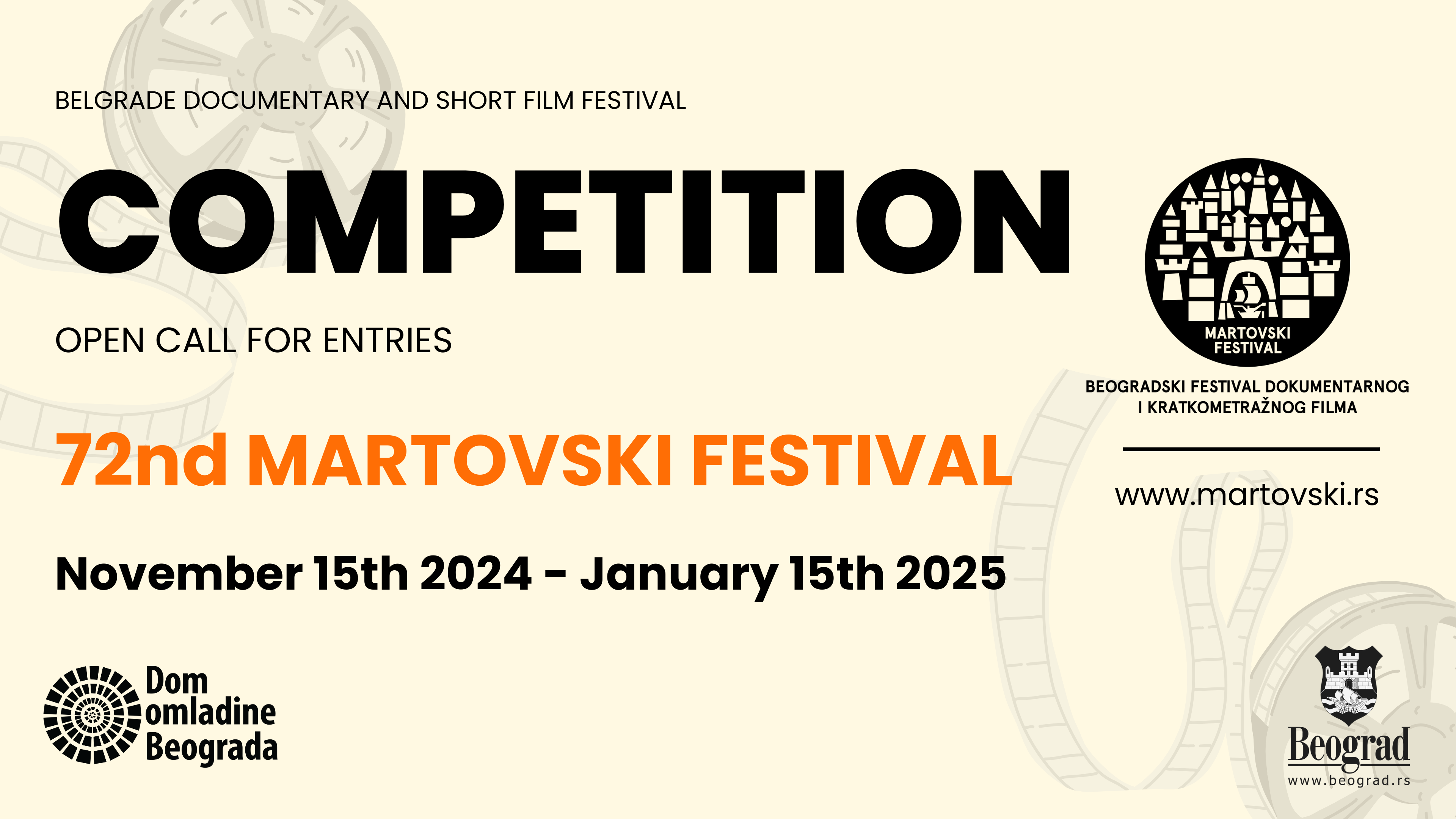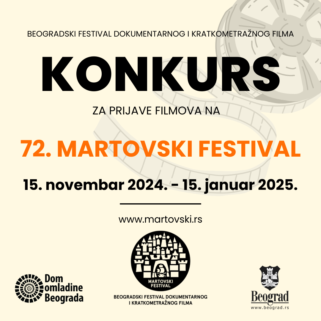 The Festival Board and the Belgrade Youth Centre hereby inform all producers and filmmakers from Serbia that they can enter their submissions starting from November 15, 2024, to January 15, 2025, at the latest, for the Domestic Competition Program (documentary film with running time up to 50 minutes, documentary film with running time over 50 minutes, short film, animated film, experimental film and video art) of THE BELGRADE DOCUMENTARY AND SHORT FILM FESTIVAL – MARTOVSKI FESTIVAL, 72nd EDITION.