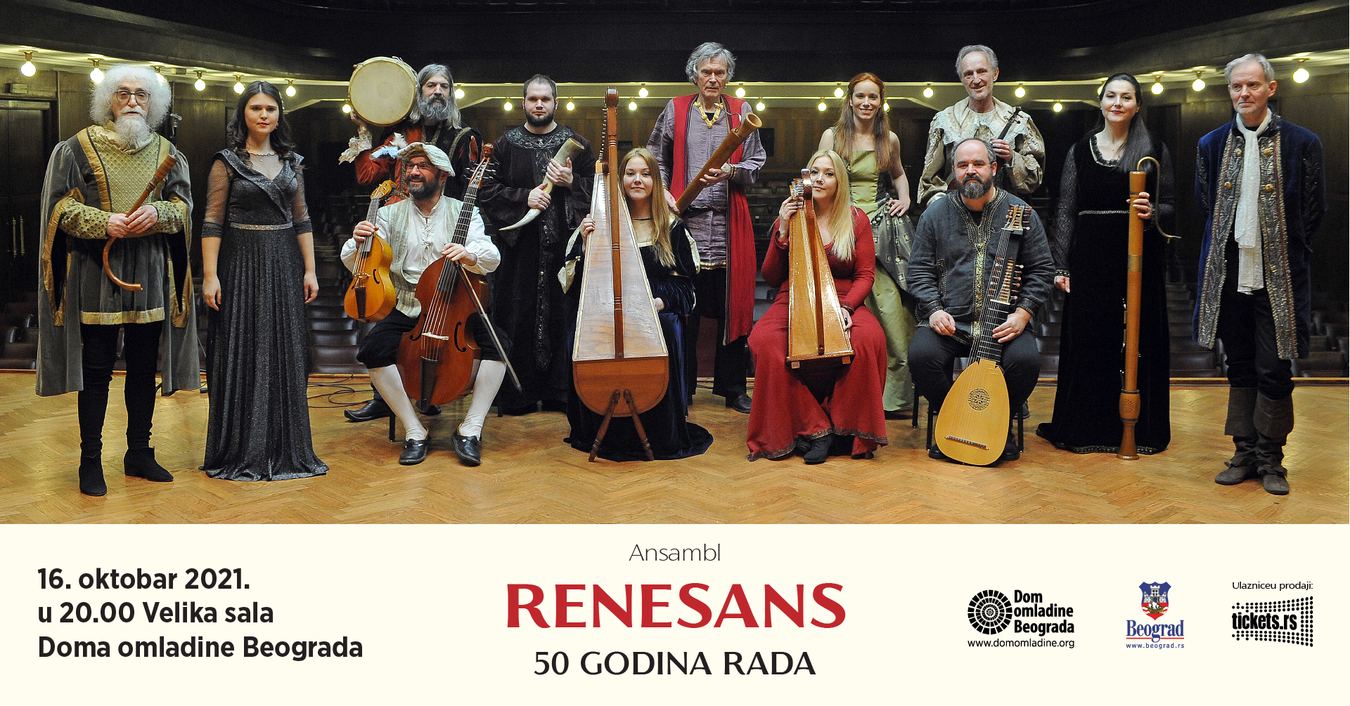 Dom omladine Beograda u subotu, 16. oktobra od 20 časova publici predstavlja veliki slavljenički koncert Ansambla RENESANS, najstarijeg ansambla za ranu i tradicionalnu muziku u čitavoj Evropi. Nastup je upriličen povodom obeležavanja jubileja: 50 godina rada, a ulaznice po ceni od 300 RSD su u prodaji na Ticket Vision Blagajni u DOB-u.