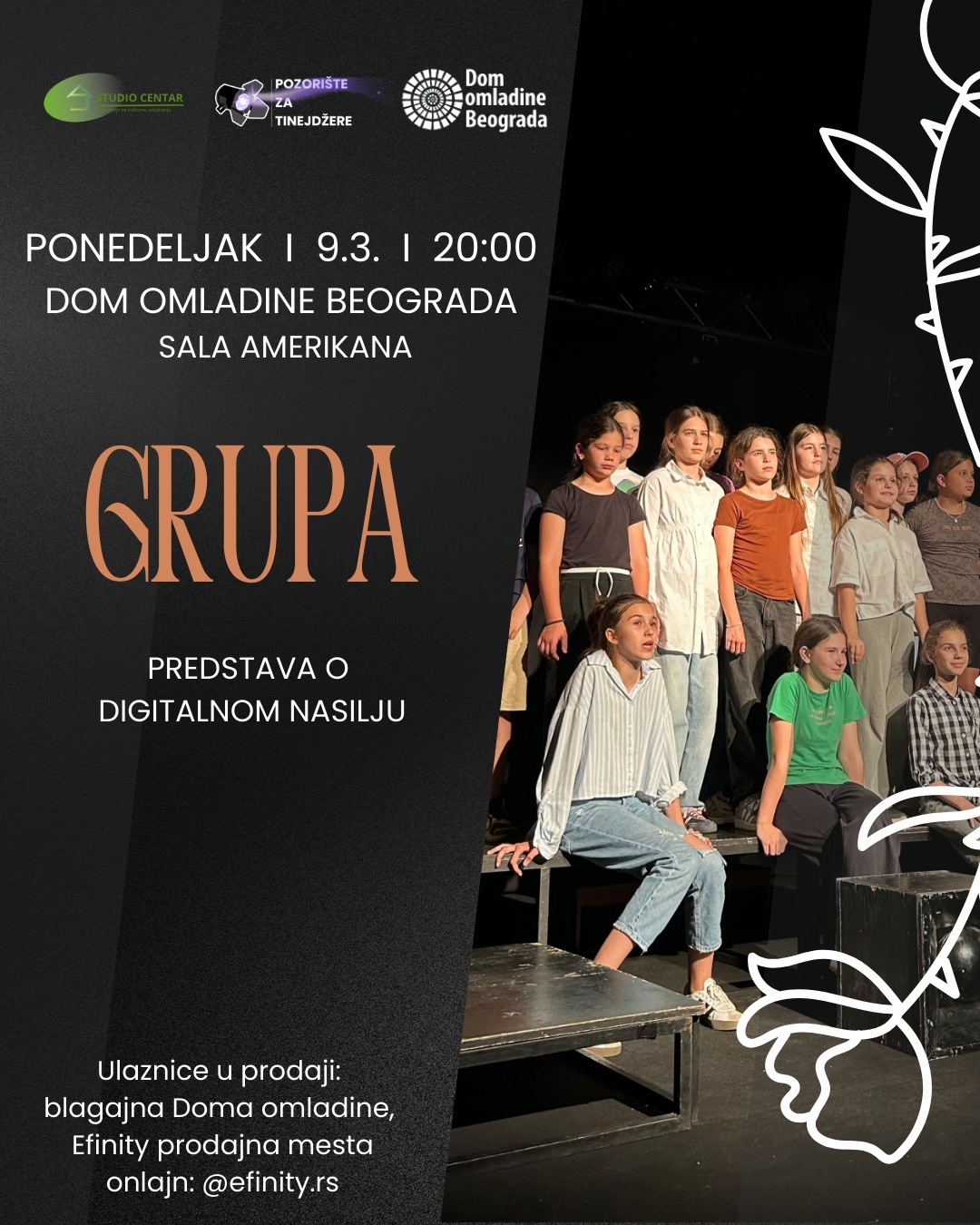 Predstava „Grupa“ otvara svet u kome poruke bole, fotografije postaju oružje, a „izazovi“ prerastaju u zlostavljanje. Nasilje koje počinje na ekranu ostavlja stvarne, duboke posledice — po identitet, odnose i samopouzdanje.
