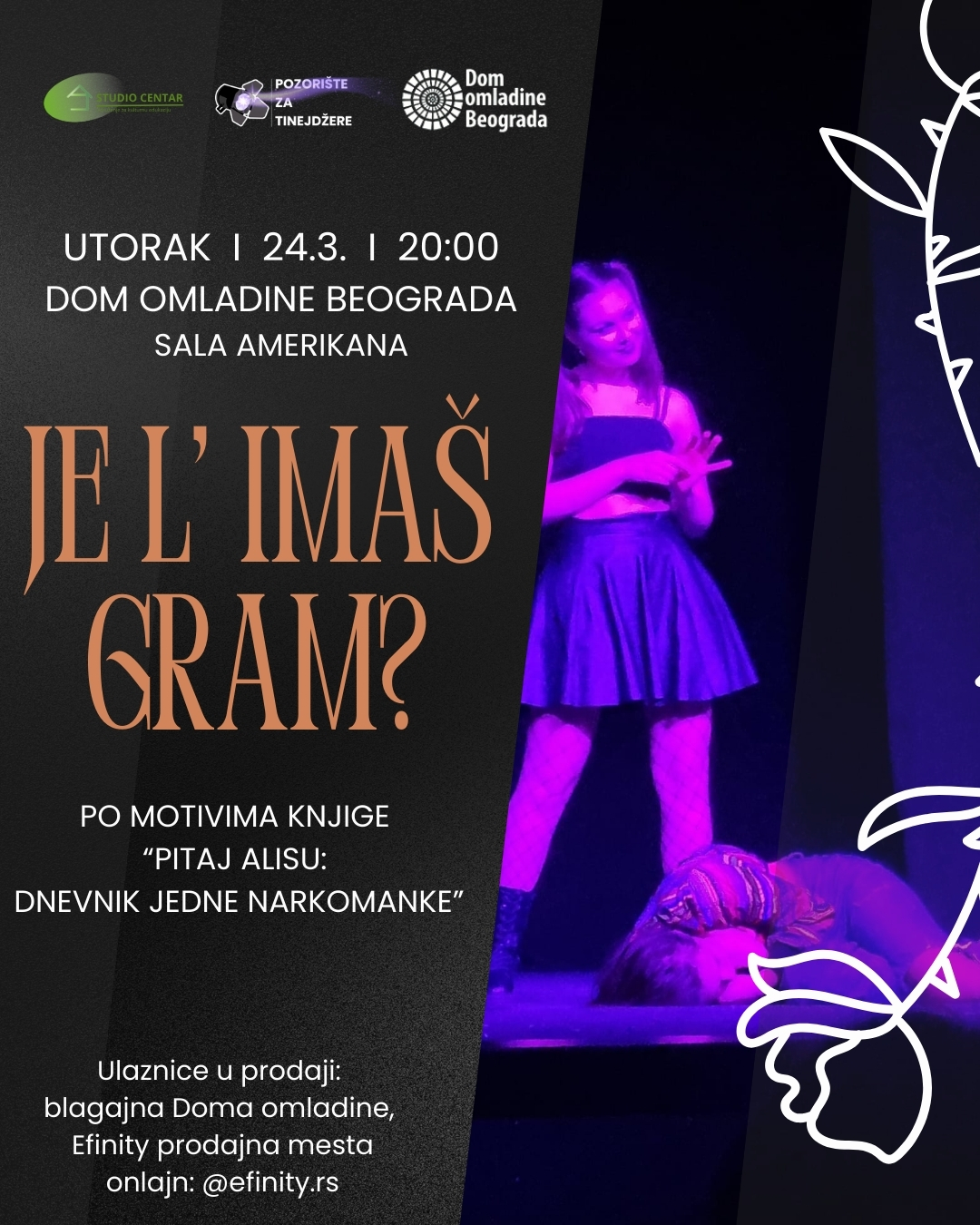 Intimna, direktna i bez zadrške — „Je l’ imaš gram?“ vodi publiku u svet u kome droga nije „problem nekog drugog“, već realnost mladih koji odrastaju danas. U intimnoj atmosferi, bez distance, publika postaje svedok i saučesnik jedne tihe, ali razorne spirale.