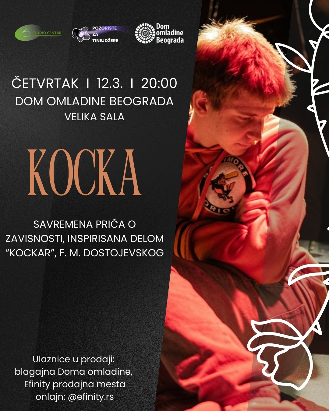 U osam snažnih scena, predstava secira mehanizam zavisnosti u savremenom okruženju: onlajn kladionice, aplikacije, reklame i pritisak da se uspeh meri brzinom i rizikom. Odjeci Dostojevskog provlače se kao paralela o opsesiji, strasti i trenutku kada igra prestaje da bude igra.
