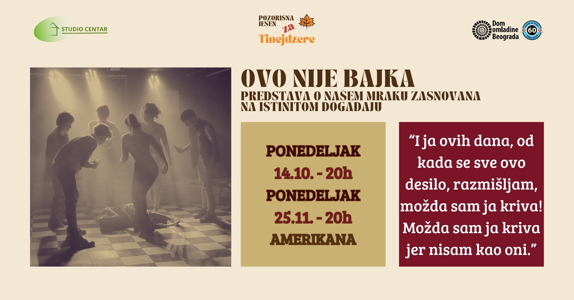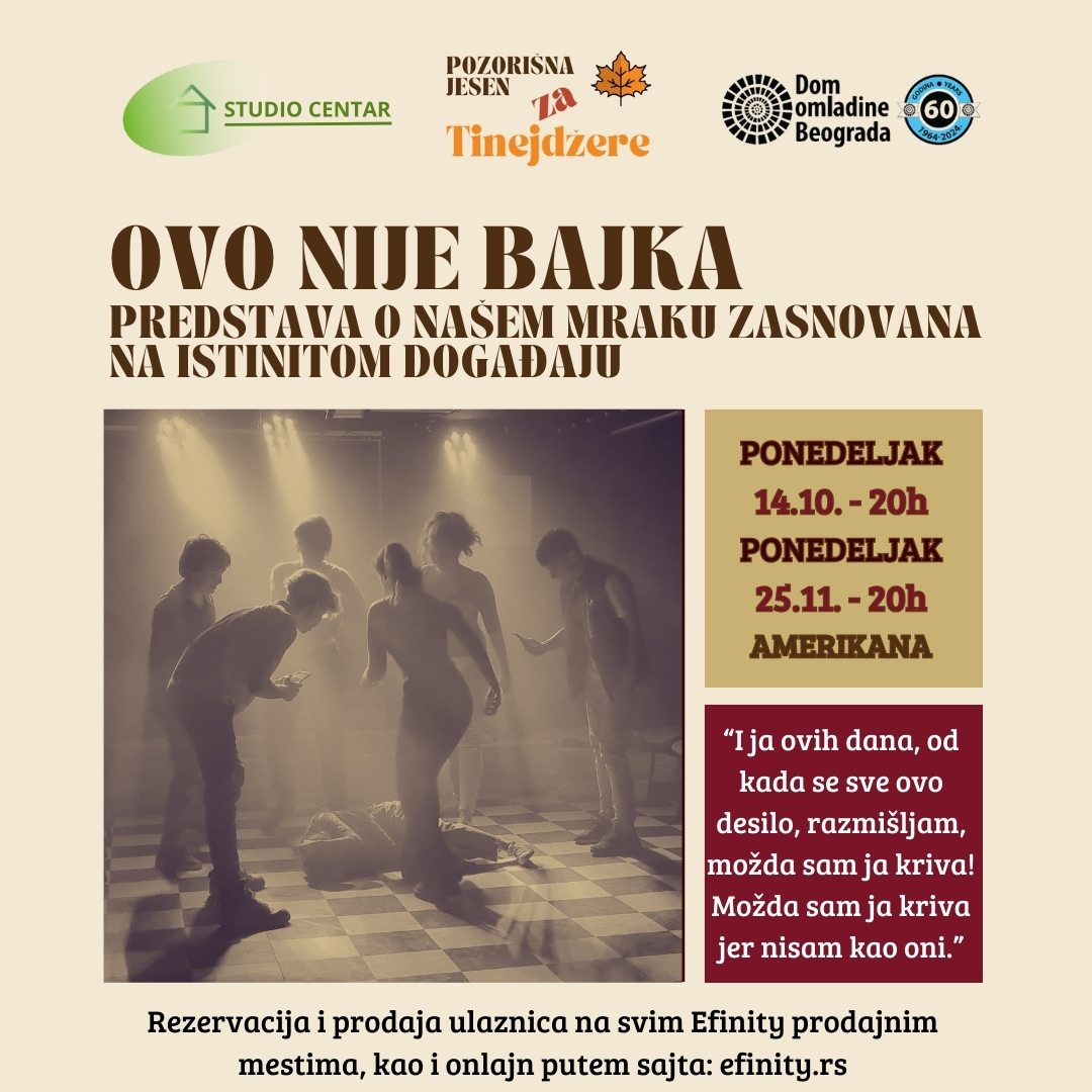 Tokom 2024. godine Dom omladine i Studio Centar zajedno realizuju edukativni pozorišni program namenjen tinejdžerima. Dva puta mesečno publika – mladi, ali i njihovi roditelji, nastavnici i pedagozi, biće u u prilici da vidi predstave koje obrađuju aktuelne teme iz života tinejdžera: narkomanija, vršnjačko nasilje, marginalizovane grupe mladih, problemi odbacivanja, otuđenje, anoreksija… Istovremeno, kroz ovaj ciklus predstava, DOB i Studio Centar kreiraće platformu za razgovor o svemu onome što direktno utiče na život i sazrevanje tinejdžera.